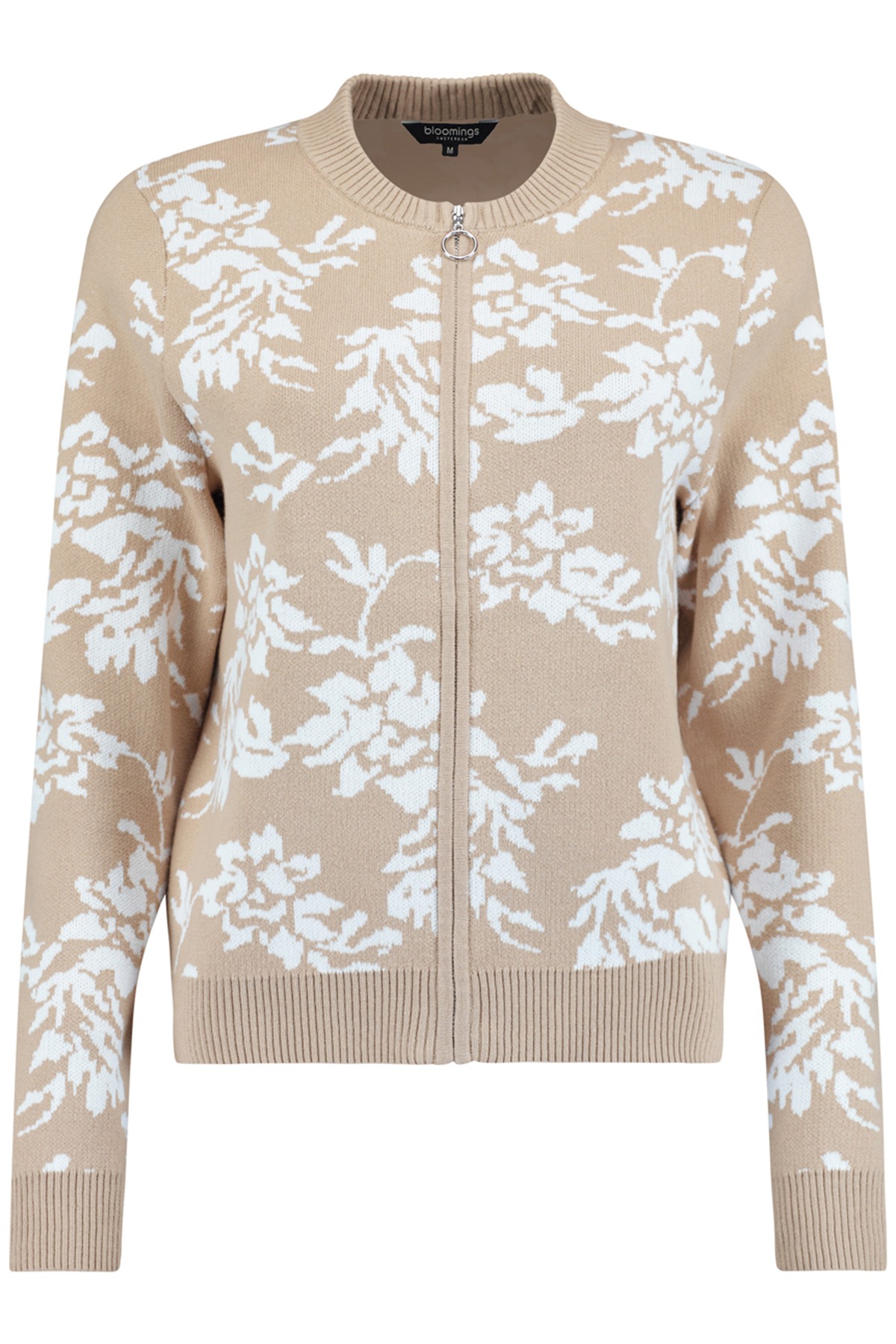 Koftan har en vacker beige basfärg prydd med ett stiliserat blommönster i vitt, vilket skapar en harmonisk och sofistikerad kontrast. Designen inkluderar en klassisk rund halsringning med en finribbad mudd som går igen vid både ärmsluten och nederkanten. Den praktiska dragkedjan framtill har en dekorativ ringdetalj som ger en extra touch av stil. Med sin normala passform och mångsidiga look fungerar den lika bra över en klänning som till ett par stilrena chinos.