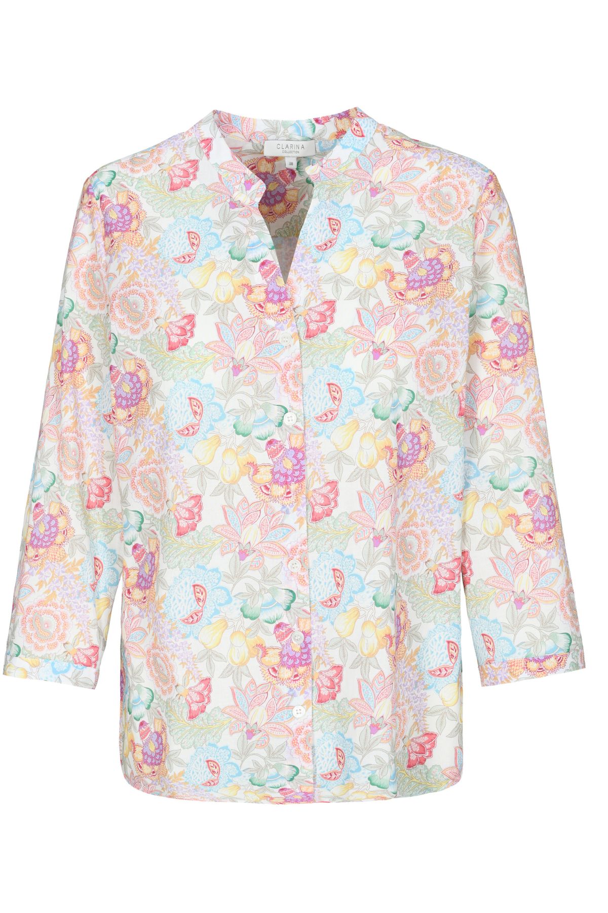 Låt din stil blomma med Clarina Blus Laguna, en vacker och luftig blus som sprider en känsla av sommar och elegans. Denna modell pryds av ett detaljrikt och konstnärligt blommönster i mjuka pastelltoner av rosa, gult, turkost och lila mot en krämvit bas. Det är ett plagg som kombinerar en klassisk silhuett med en modern, feminin färgsättning.