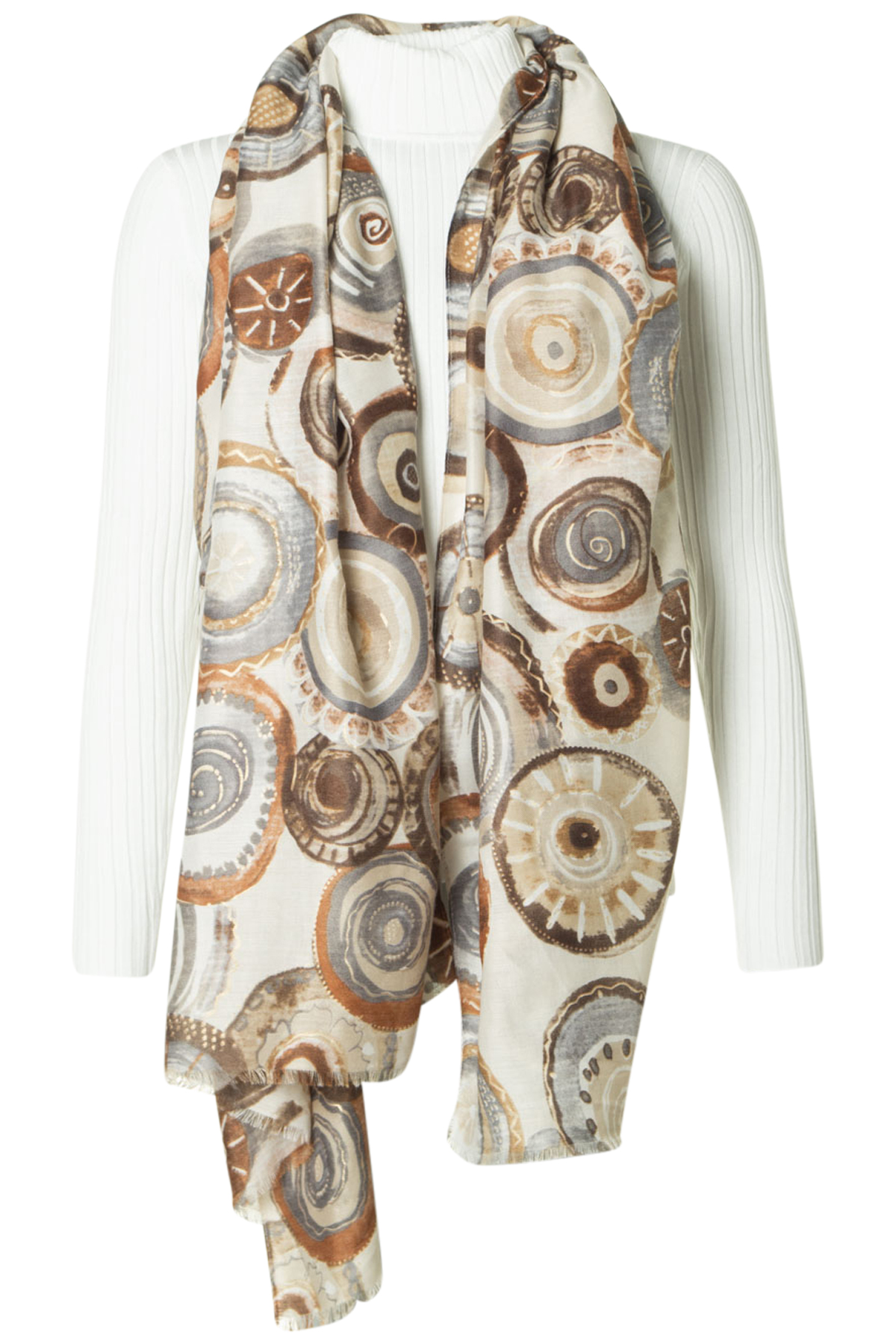 Clarina Sjal Morgenrot är en mjuk och stilfull sjal med ett vackert mönster i varma beige-bruna toner, med inslag av ljusgrått och guld. Med sin generösa storlek på 84 x 183 cm kan den bäras på många sätt – svept över axlarna, draperad runt halsen eller som en elegant detalj till kappan.