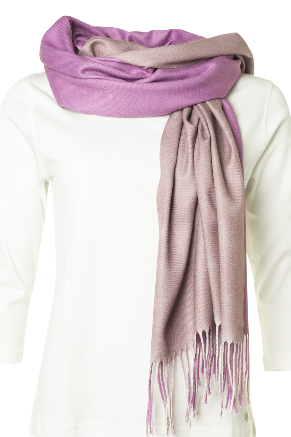 En klassisk mjuk sjal från Clarina med fransar och “double-face” i två rosa toner. Sjalen är tillverkad av en varm viskos/ull-kvalitet. Denna sjal kan du kombinera med din vardagsjacka, men också med en elegant kappa. En sjal som har vad som krävs för att bli din favoritaccessoar.
