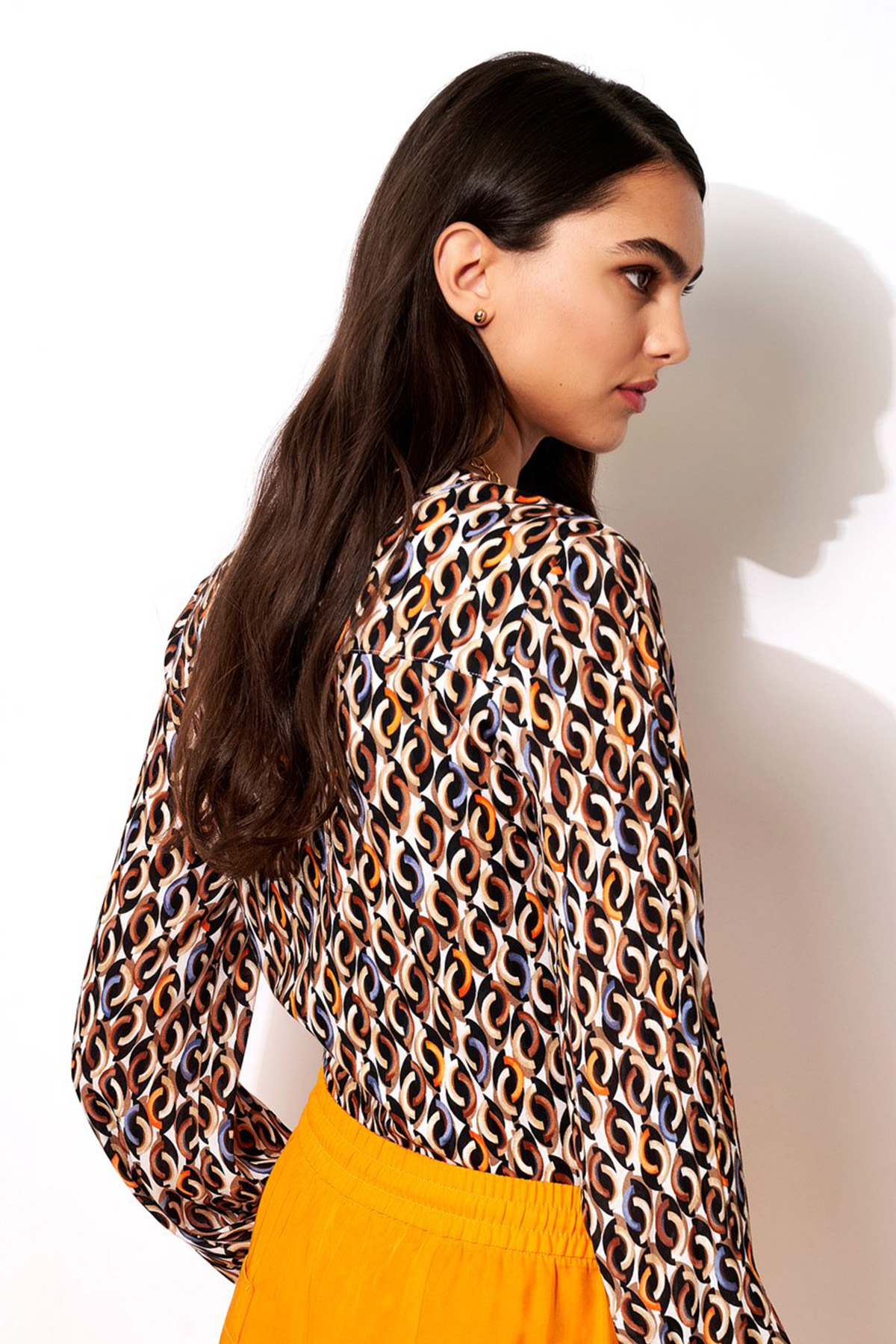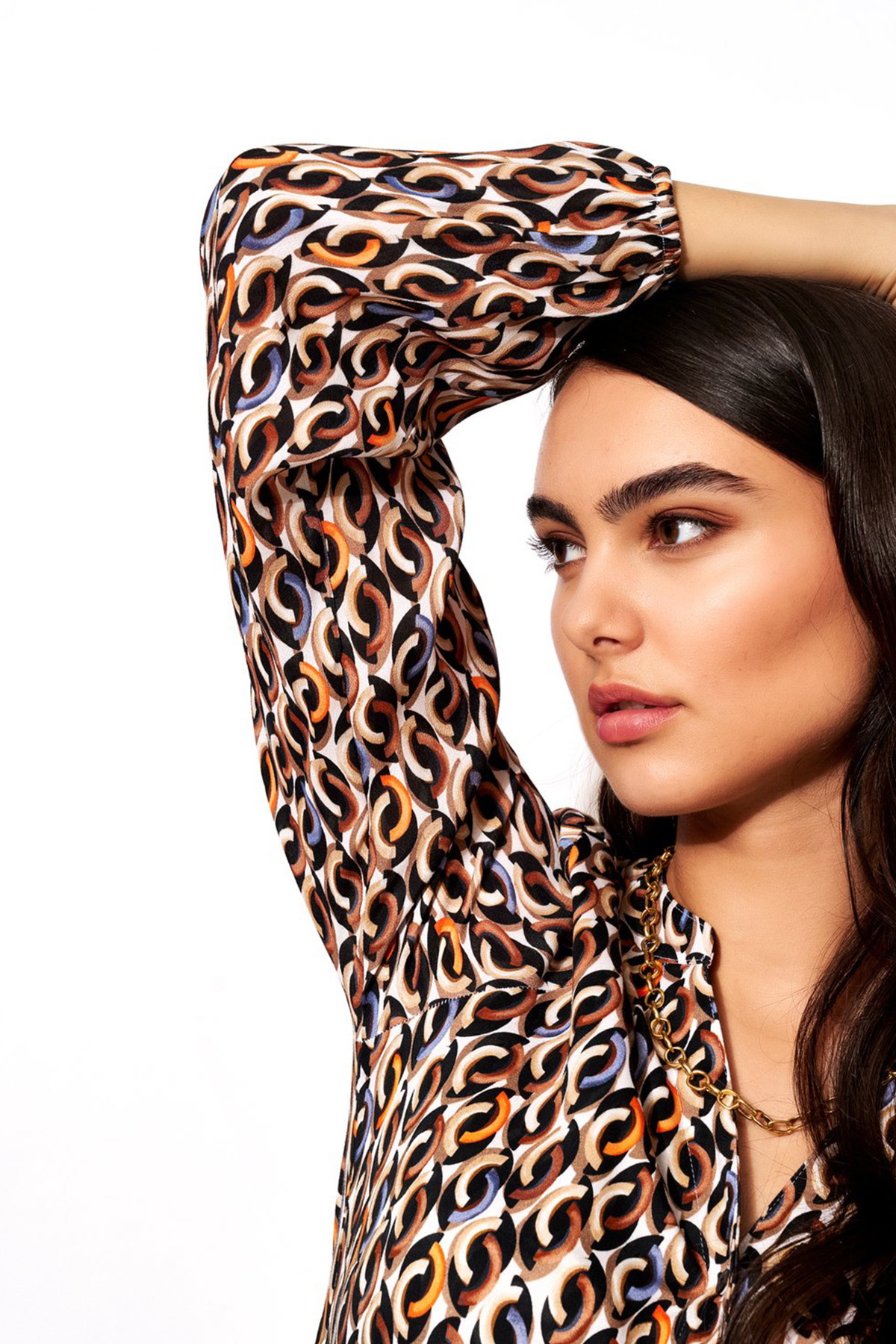 V-ringad mönstrad blus från Desoto. Blusen är rak i modellen och normal i passformen. Den knäpps med fem stycken knappar framtill och har resår runt ärmslutet. På ärmarna är materialet något skir. Skjortan är gjord i en mjuk och bekväm bomullskvalitet.