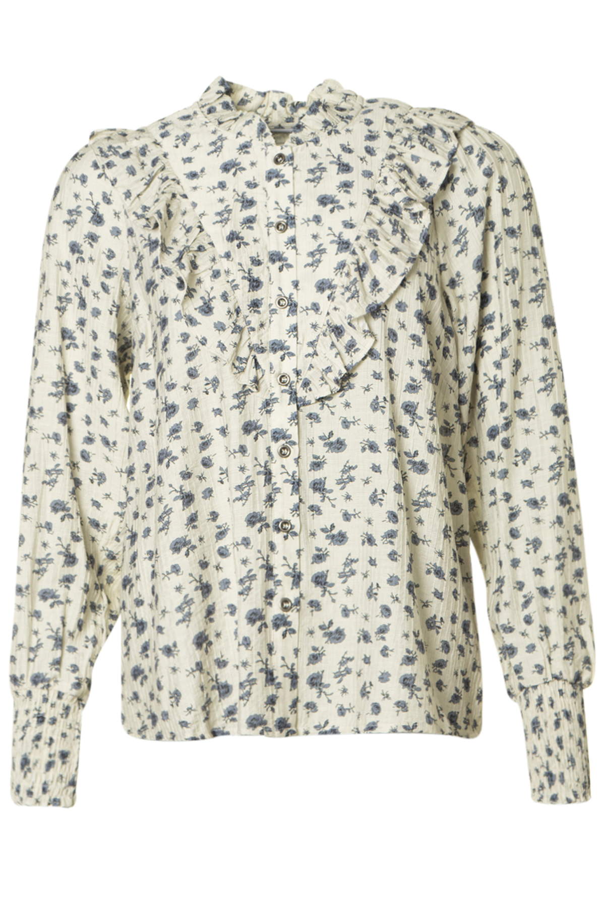 In Front Bloom Blus Meadow är en elegant blus som kombinerar tidlös stil med subtila feminina inslag. Den har rund halsringning med en liten volang och ett vackert infällt bröstparti med volang runt.... Läs mer...