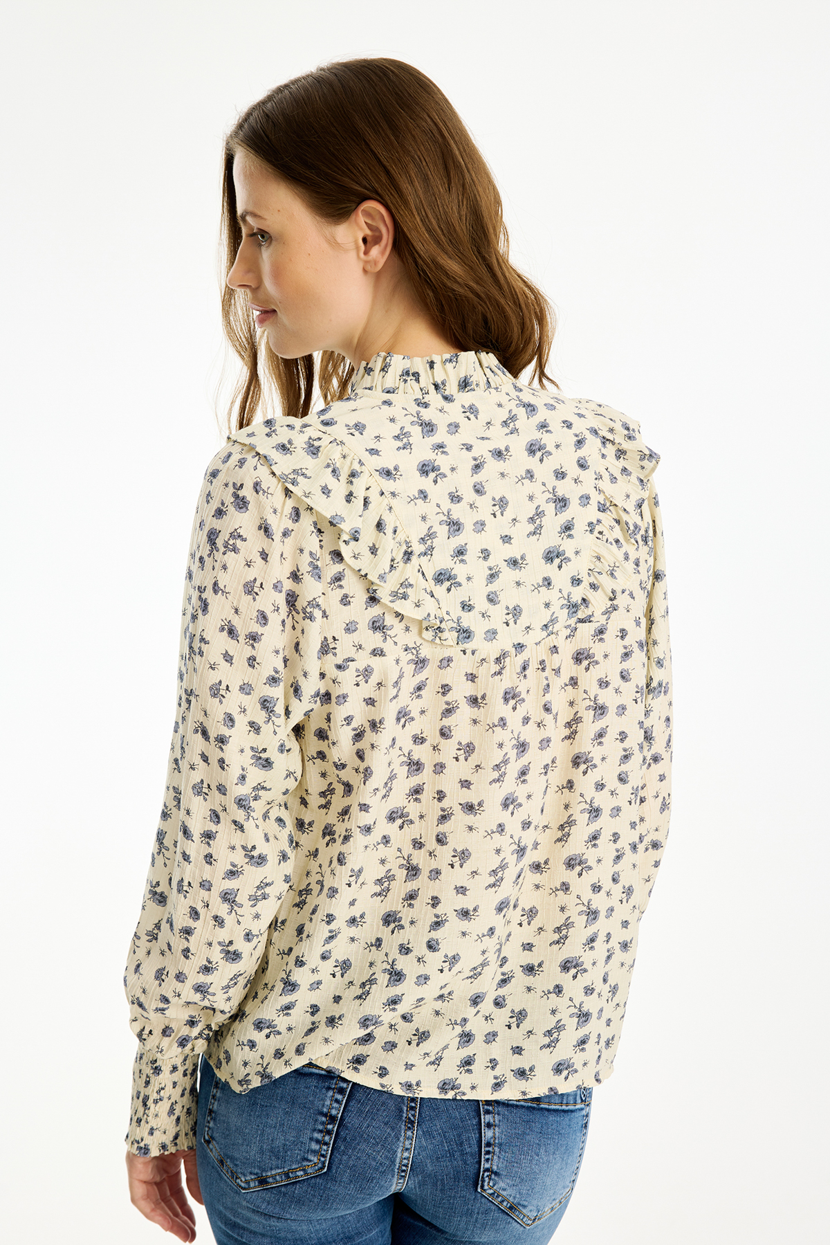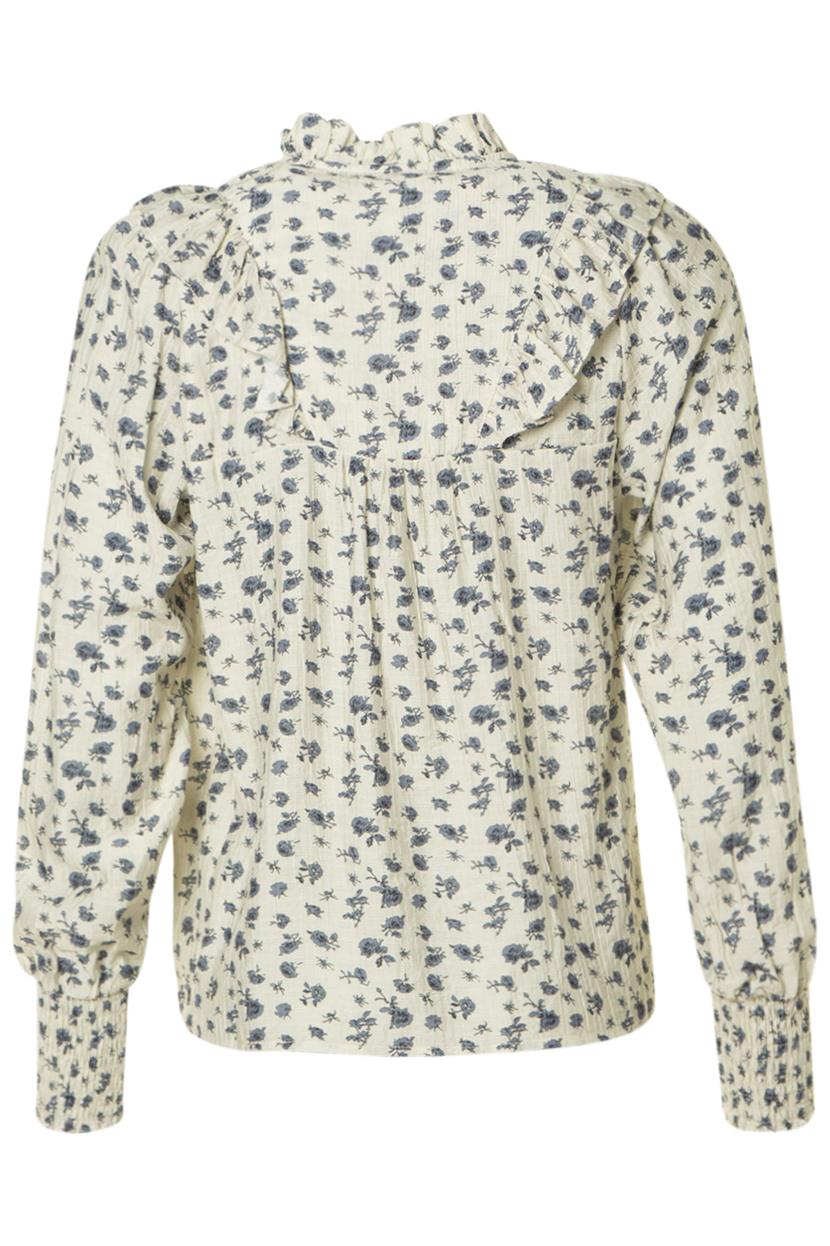 In Front Bloom Blus Meadow är en elegant blommig blus som kombinerar tidlös stil med subtila feminina inslag. Den har rund halsringning med en liten volang och ett vackert infällt bröstparti med volang runt, vilket ger blusen en romantisk tuch. Passformen är rak och ledig, vilket gör den enkel att bära både instoppad och utanpå. De långa ärmarna avslutas med en bred smock-resår somskapar en mjuk volym och en fin siluett. Tillverkad i en sval, lätt krinklad viskosmix. In Front Bloom Blus Meadow både bekväm och stilfull – perfekt för både vardag och festligare tillfällen.