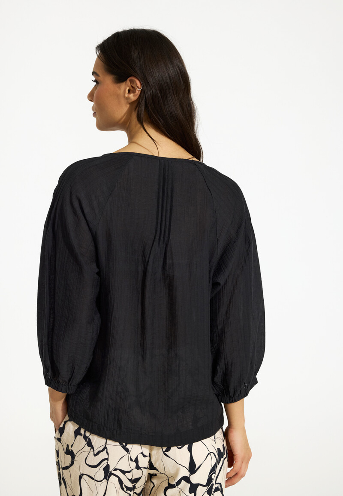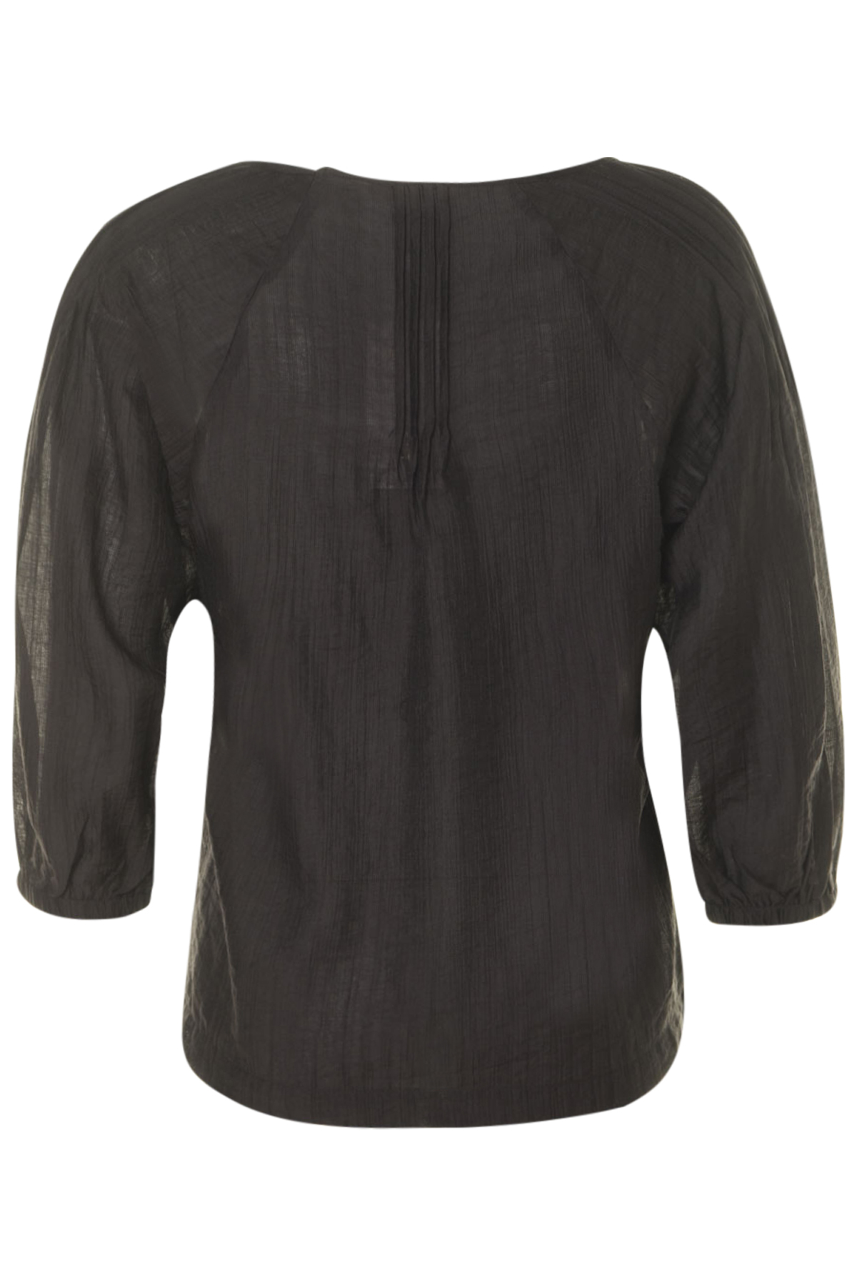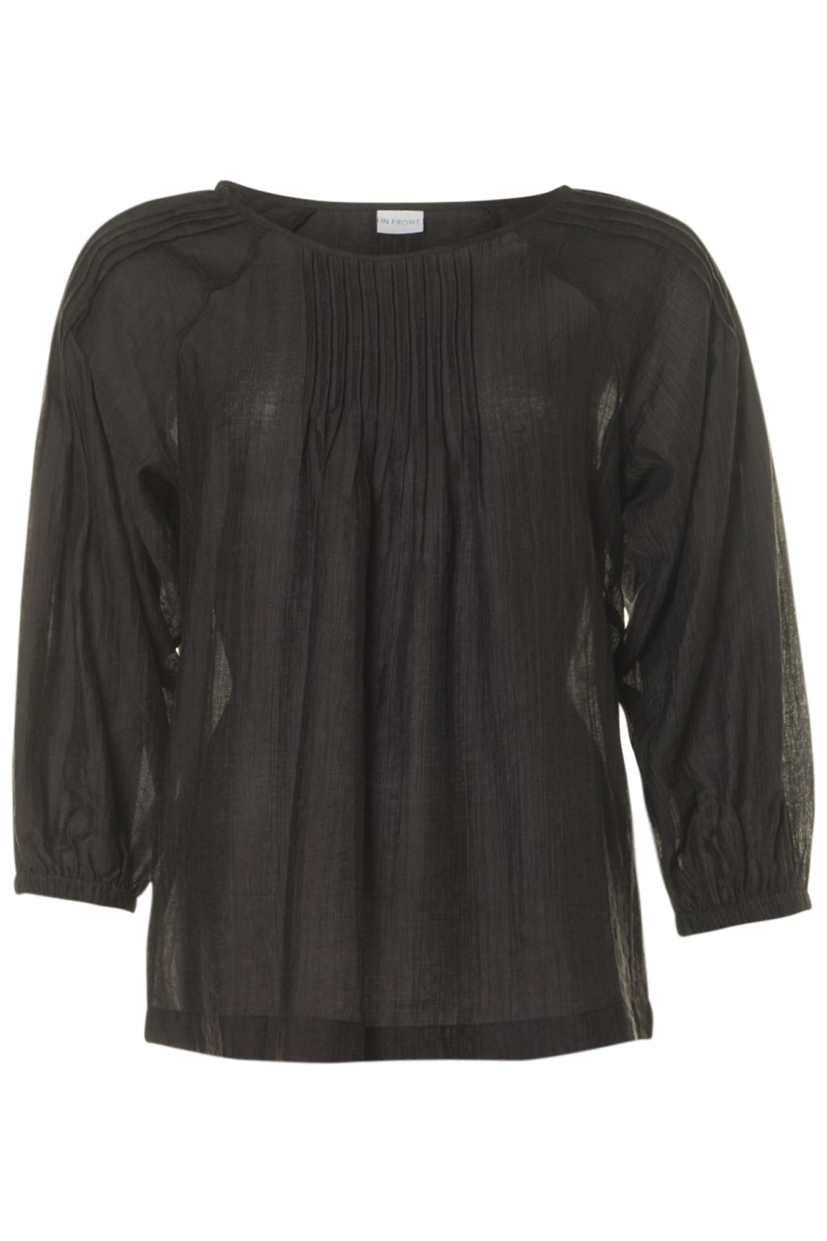 En fin In Front-blus med rund hals och dekorativa sydda stråveck på axlar och från halsringningen mitt fram och bak. Blusen är rak i modellen och lös i passformen. Den har vida raglanärmar i 3/4-längd med resår nedtill.