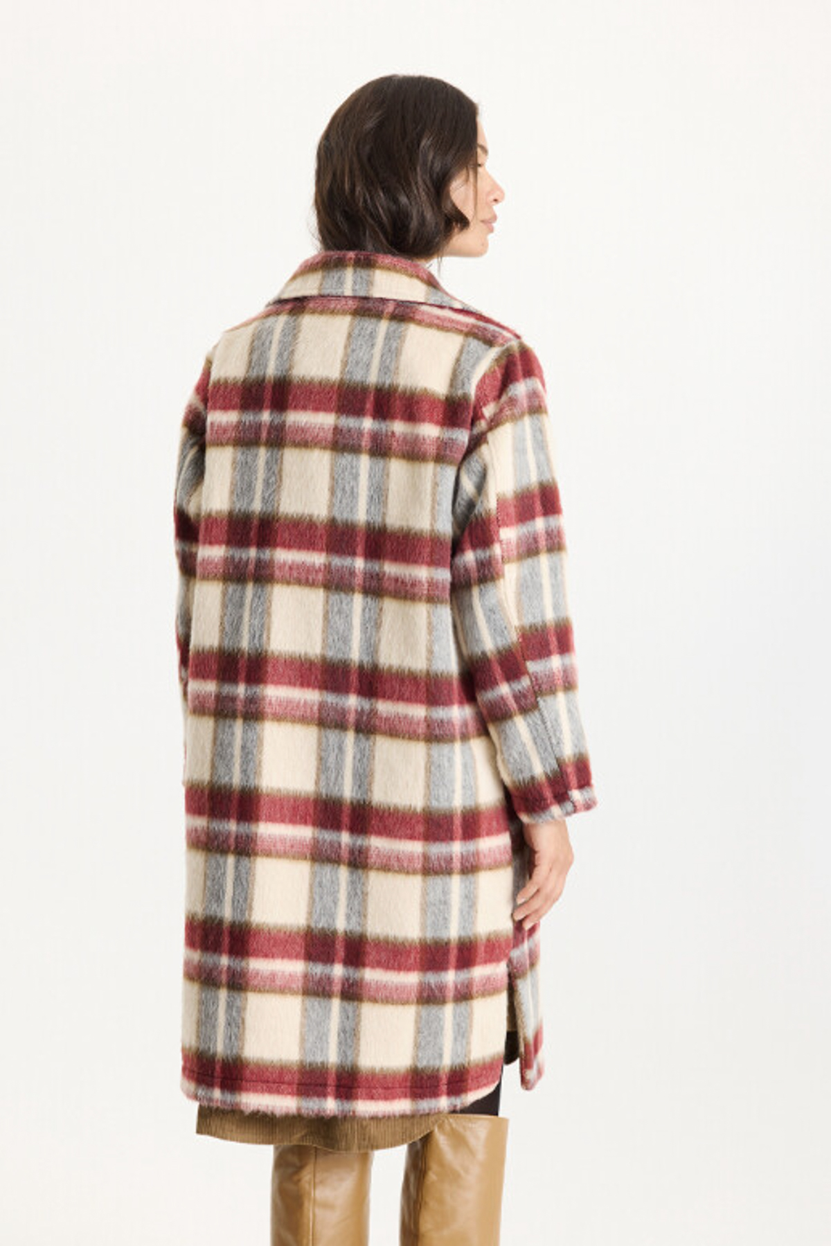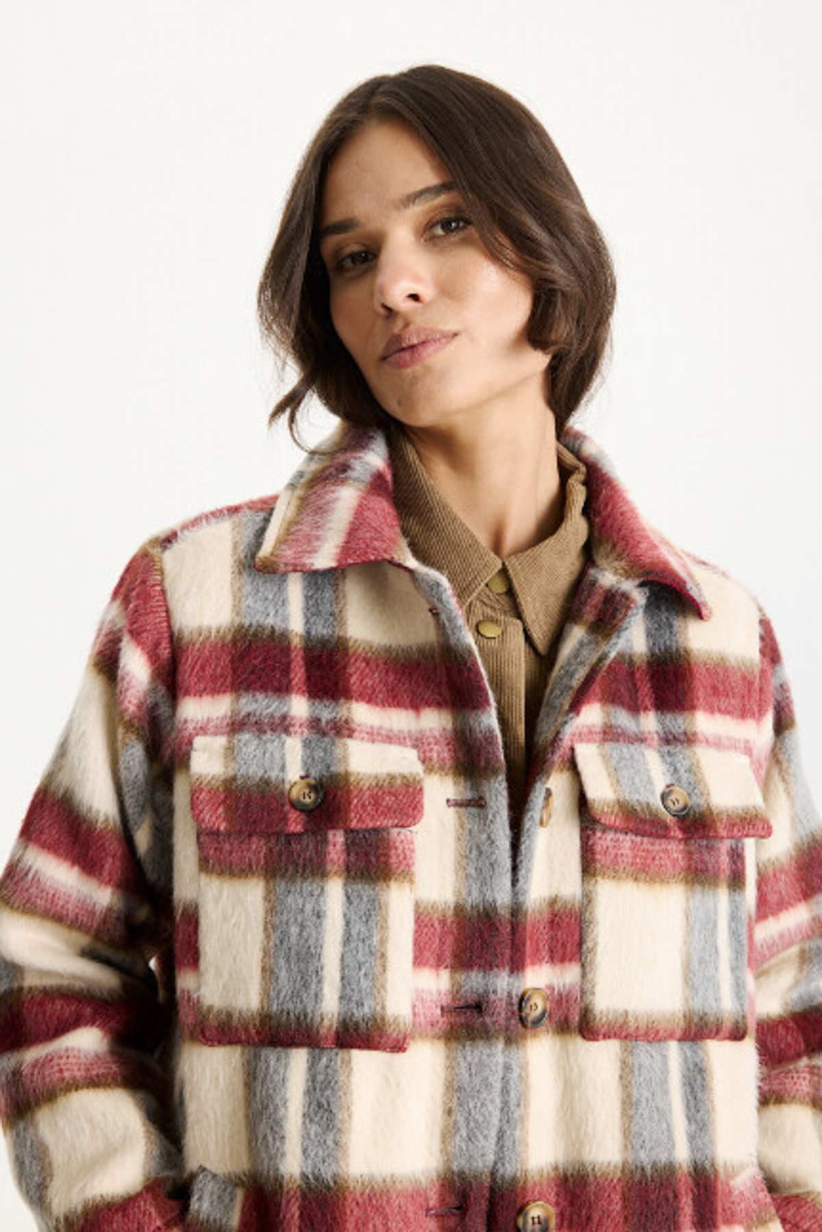 In Front Carrie Jacka är en trendig och mysig långjacka som direkt lyfter din höst- och vinterstil. Det fluffiga, rutiga materialet ger en härlig retro-vibe med en touch av country och cool cowboystil. En perfekt statement-jacka när du vill hålla dig varm utan att kompromissa med looken.
