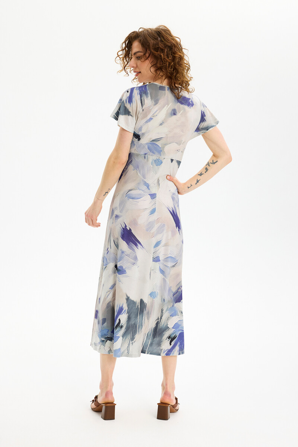 In Front Dancy Klänning Tiny en vacker mönstrad klänning med kort holkärm. Klänningen är V-ringad, något figursydd och avskuren under bysten med mer vidd nedtill.