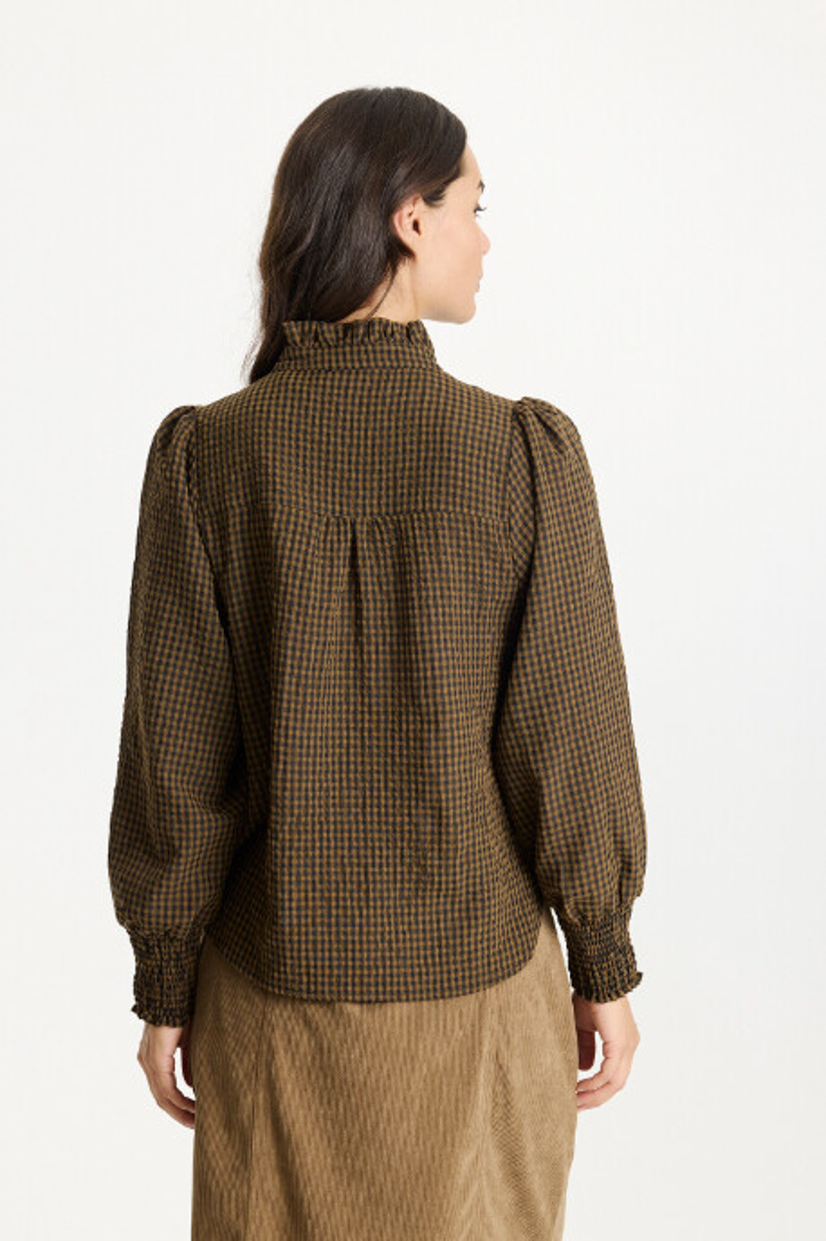 In Front Else Blus är en fin smårutig blus som kombinerar tidlös stil med subtila feminina inslag. Den har rund halsringning med en liten volang, vilket ger blusen en romantisk tuch. Passformen är rak och ledig, vilket gör den enkel att bära både instoppad och utanpå. De långa ärmarna avslutas med en bred smock-resår som skapar en mjuk volym och en fin siluett. In Front Else Blus är tillverkad i en sval, lätt krinklad bomullsmix.  både bekväm och stilfull – perfekt för både vardag och festligare tillfällen.