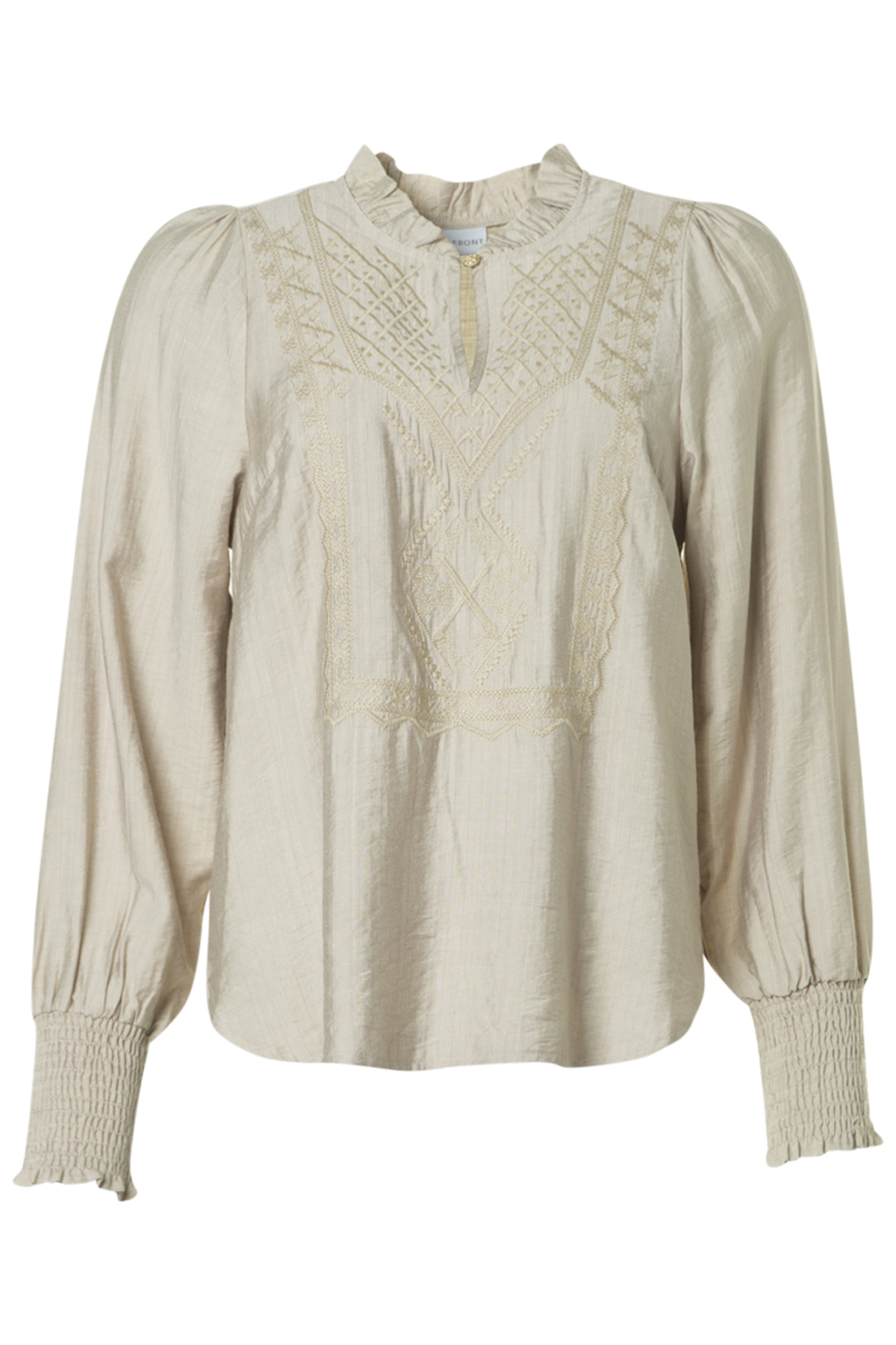 Blusen har ärm med smock-resår i manschetter och den är tillverkad av en mjuk kvalitet med vackert broderi ton i ton framtill.