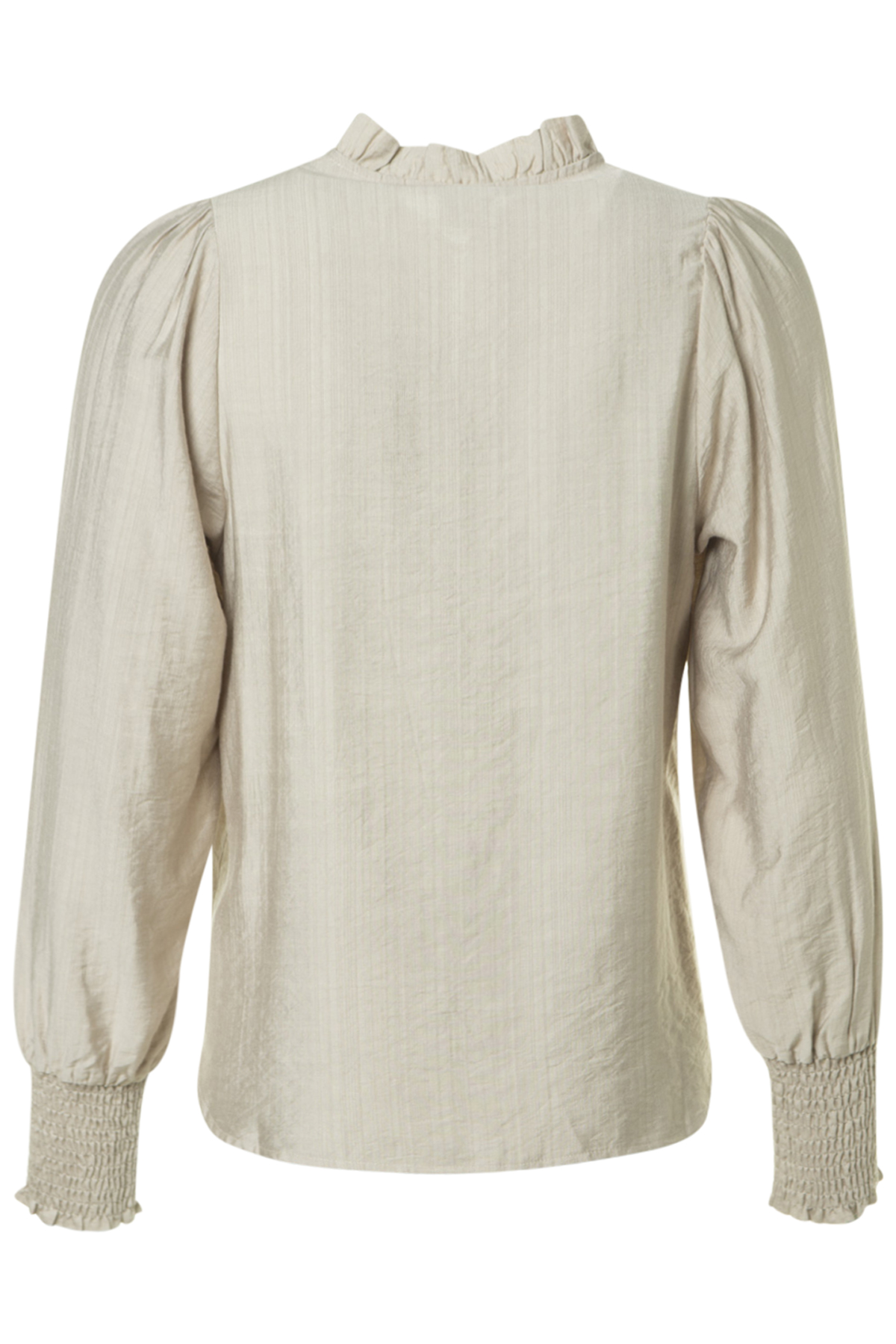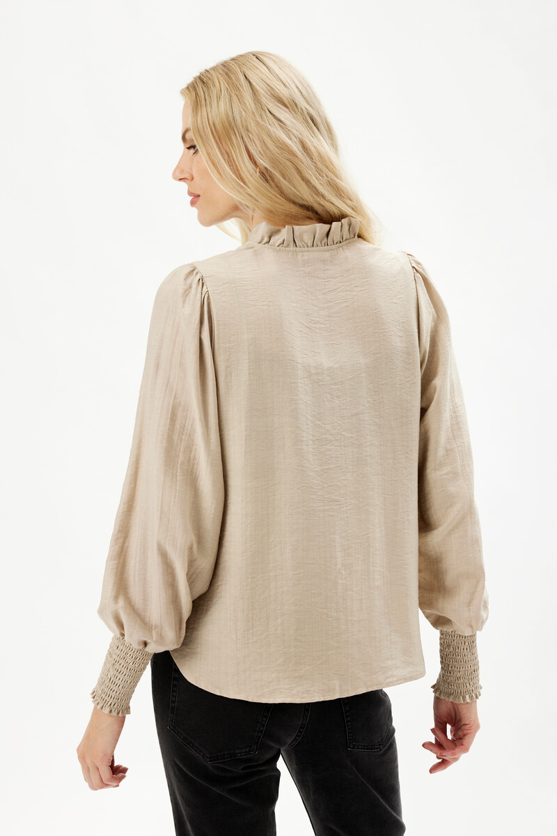 En snygg blus med sprund och knapp mitt fram och smal volang-ståkrage från In Front. Blusen är rak i modellen och rymlig i passformen.