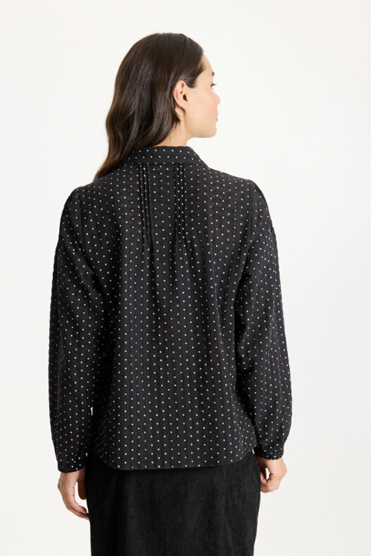 In Front Fleur Blus Dottie är en fin prickig blus som kombinerar tidlös stil med subtila feminina inslag. Den har klassiskt skjortkrage och små stråveck på ok fram och bak, samt på axelparti på ärmarna. Passformen är rak och ledig, vilket gör den enkel att bära både instoppad och utanpå. De långa ärmarna avslutas med en resår som skapar en mjuk volym och en fin siluett. Tillverkad i en sval bomull. In Front Fleur Blus Dottie både bekväm och stilfull – perfekt för både vardag och festligare tillfällen.
