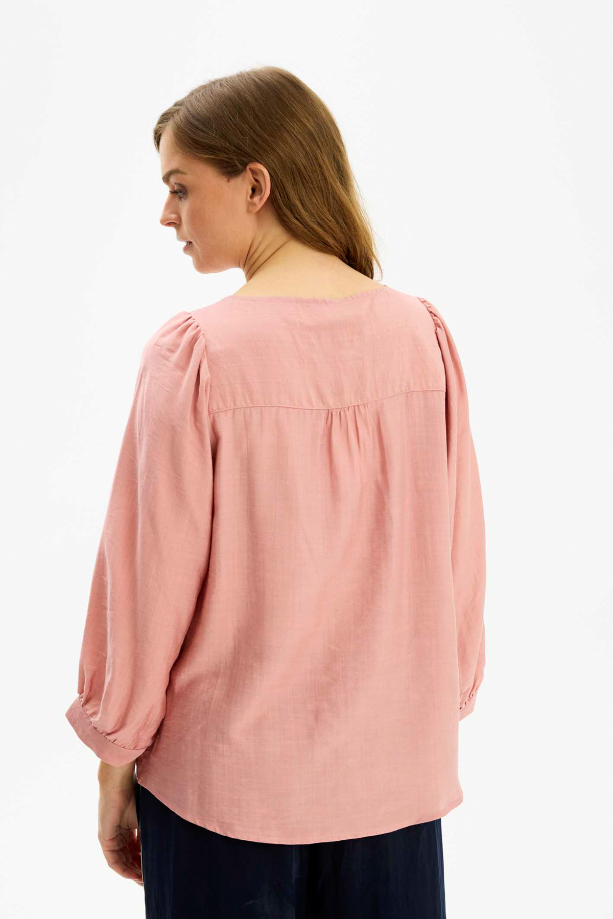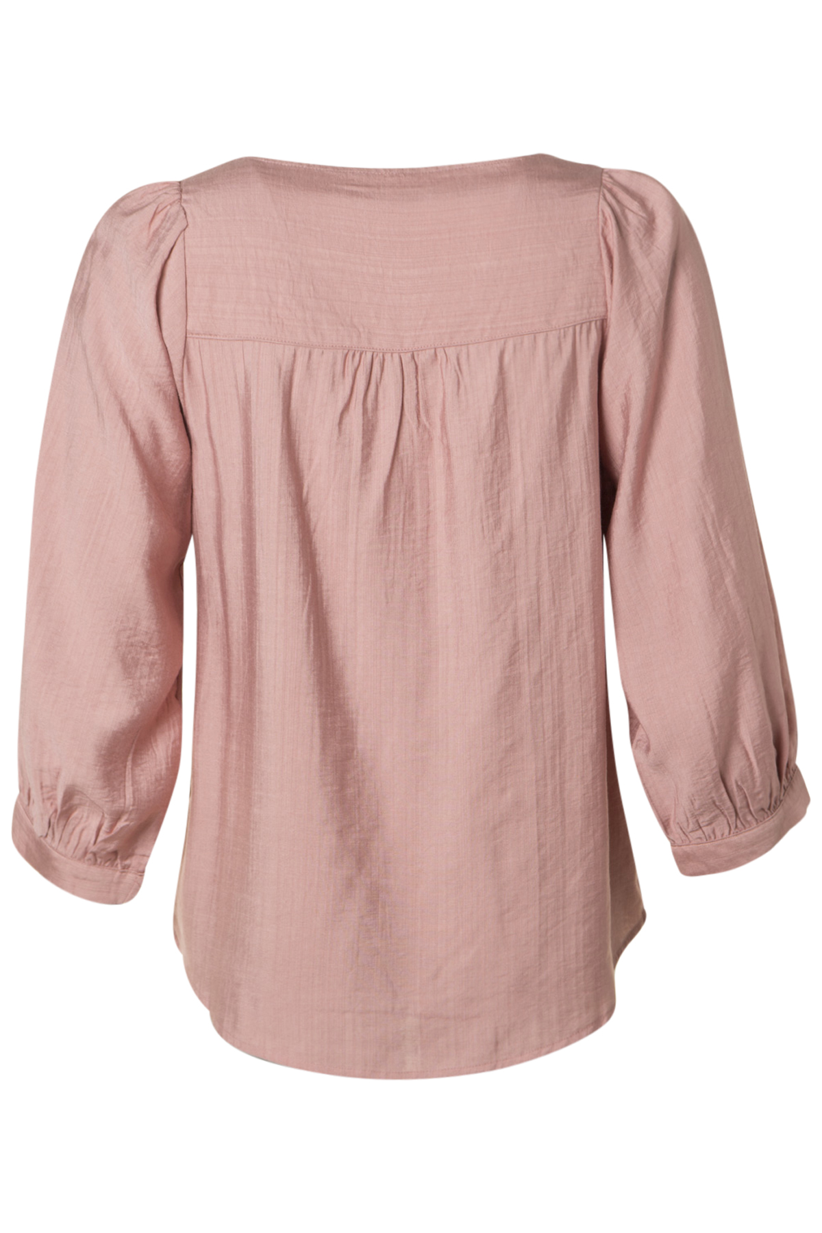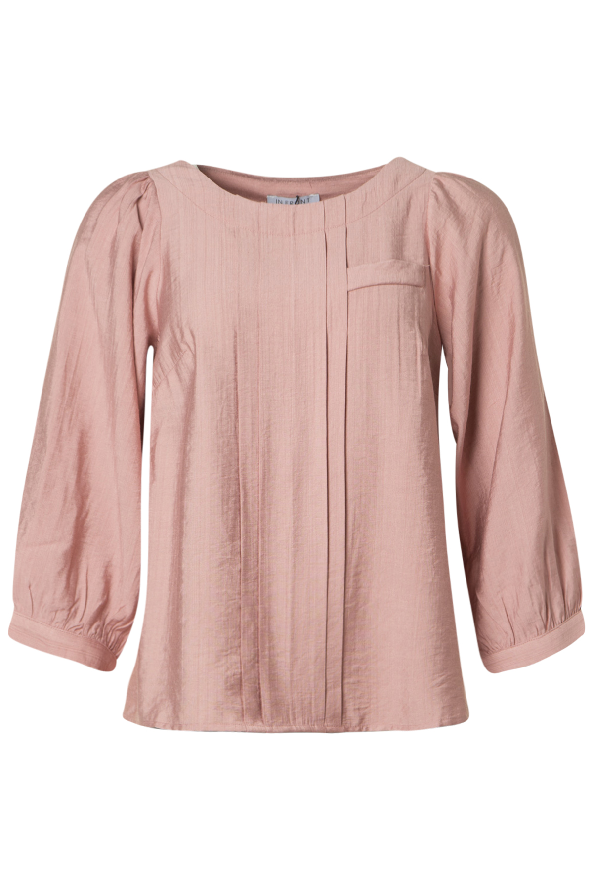 In Front Goldi Blus Hudson är en fin blus med rund hals och lagda veck mitt fram. Blusen är rak i modellen och lös i passformen och har en fusk-ficka på vänster sida på bröstet. Den har vida 3/4-långa puffärmar med smal manschett nedtill.