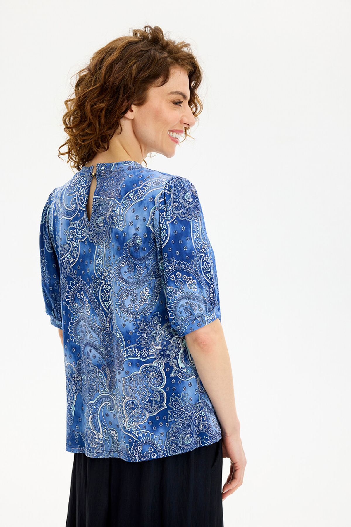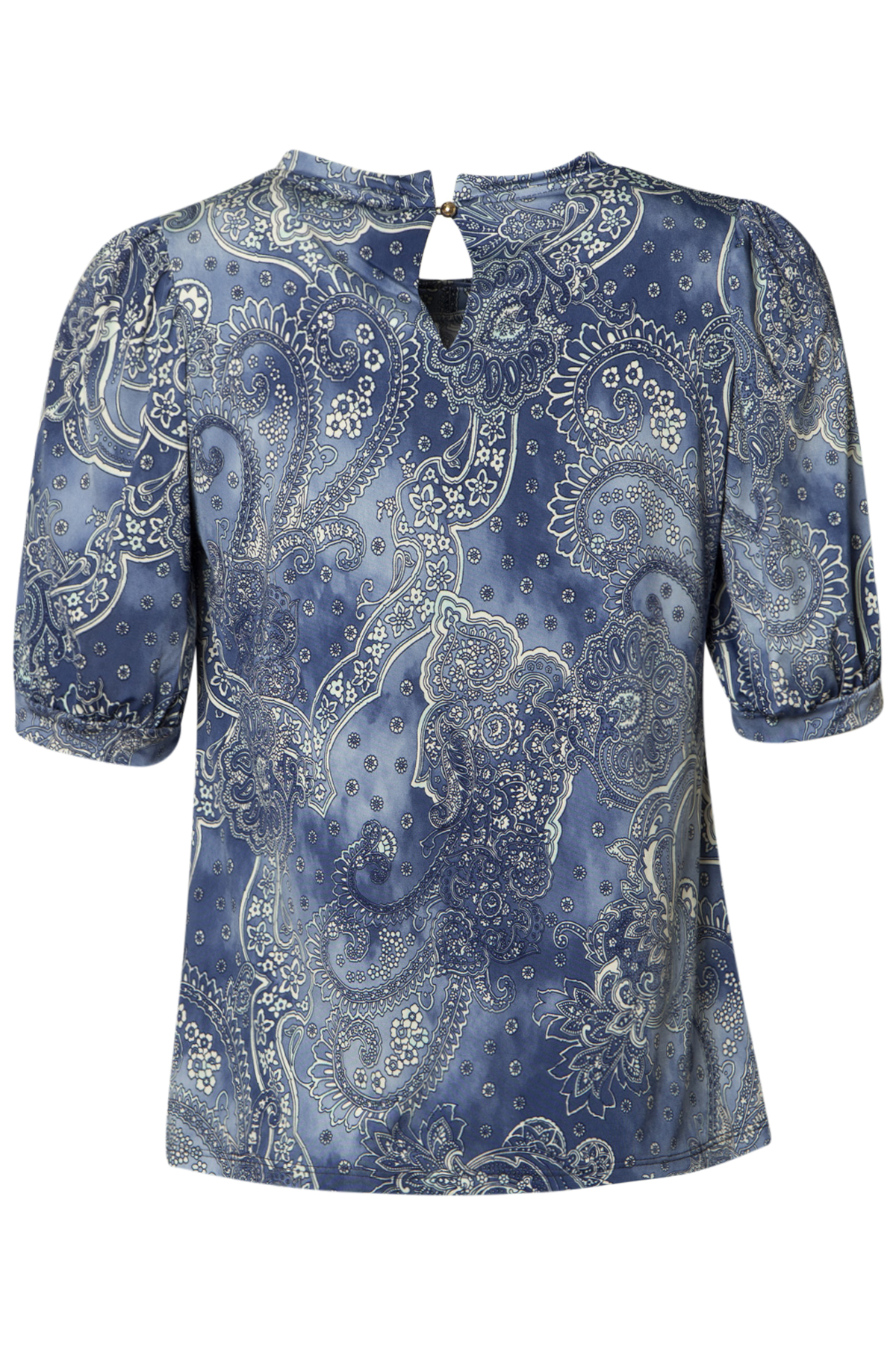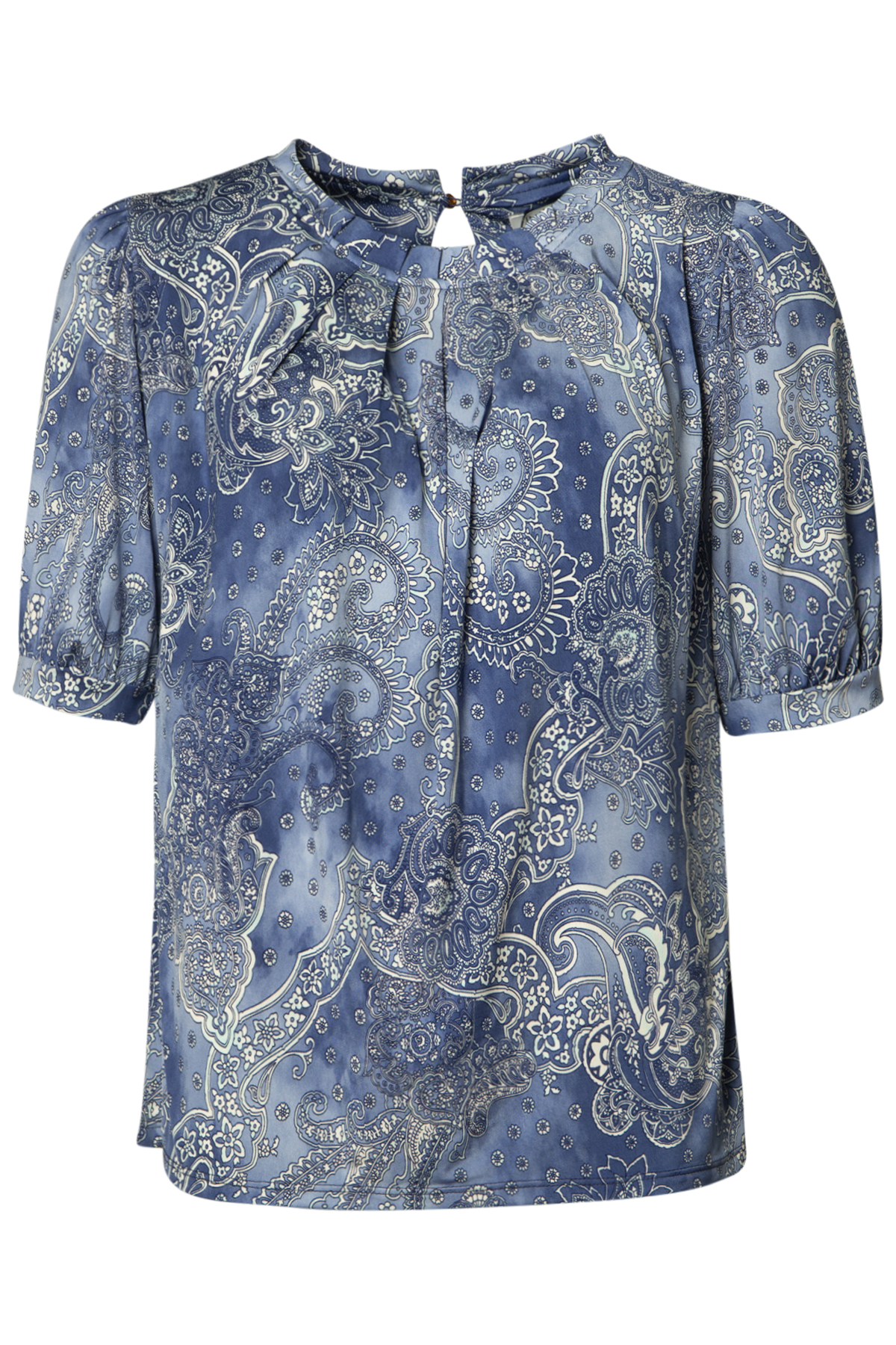 In Front Grazia Blus Greece, är en fin blus med kort puff-ärm. Blusen är rak i modellen och normal i passformen. Halsringningen har en dekorativ veckning, med volangkant och den knäpps bak i nacken.