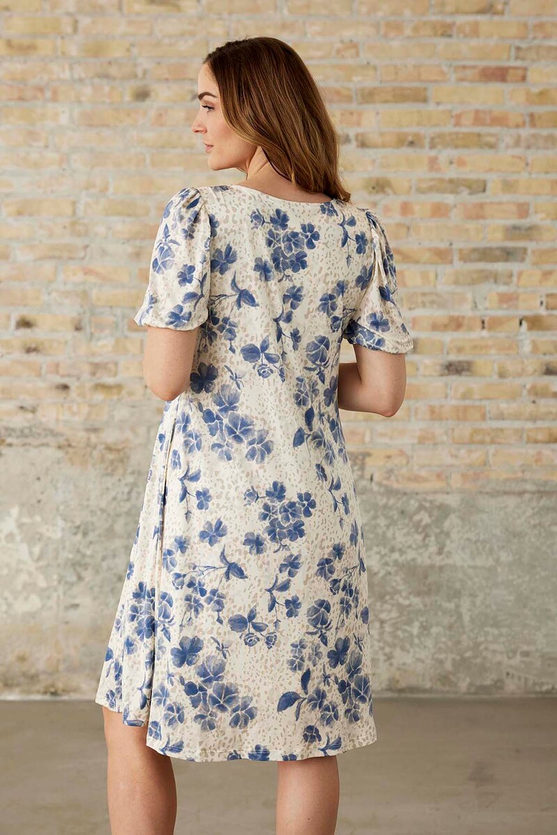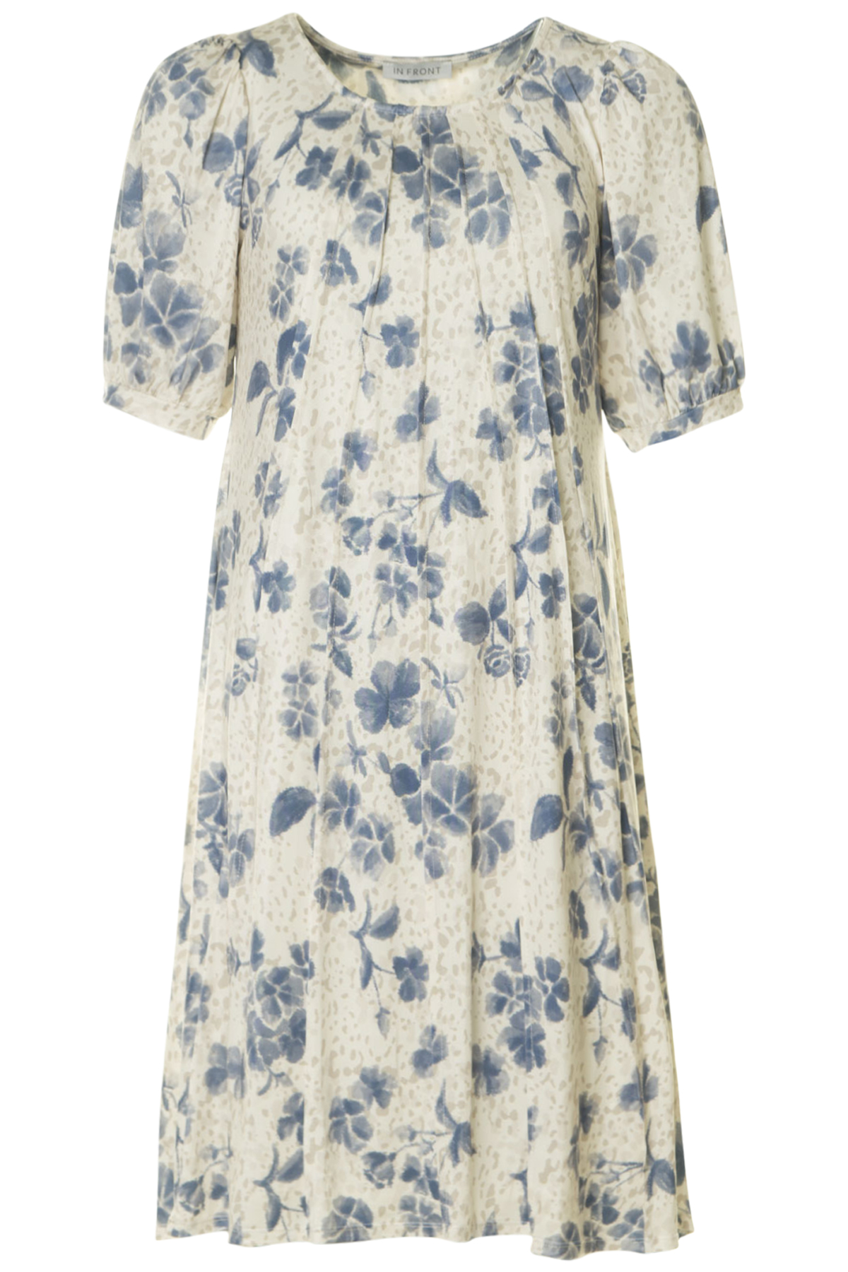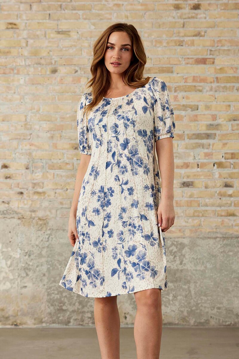 Mönstrad klänning med kort puffärm från In Front. Klänningen är något figursydd med mer vidd nedtill och normal i passformen.