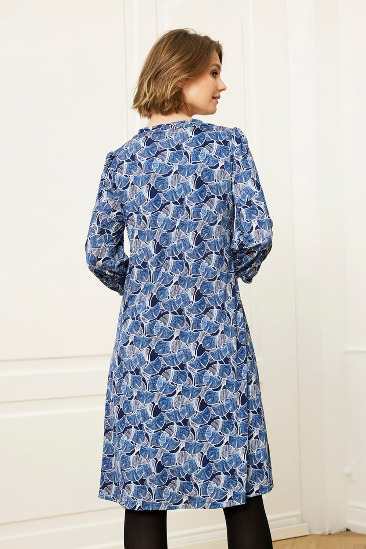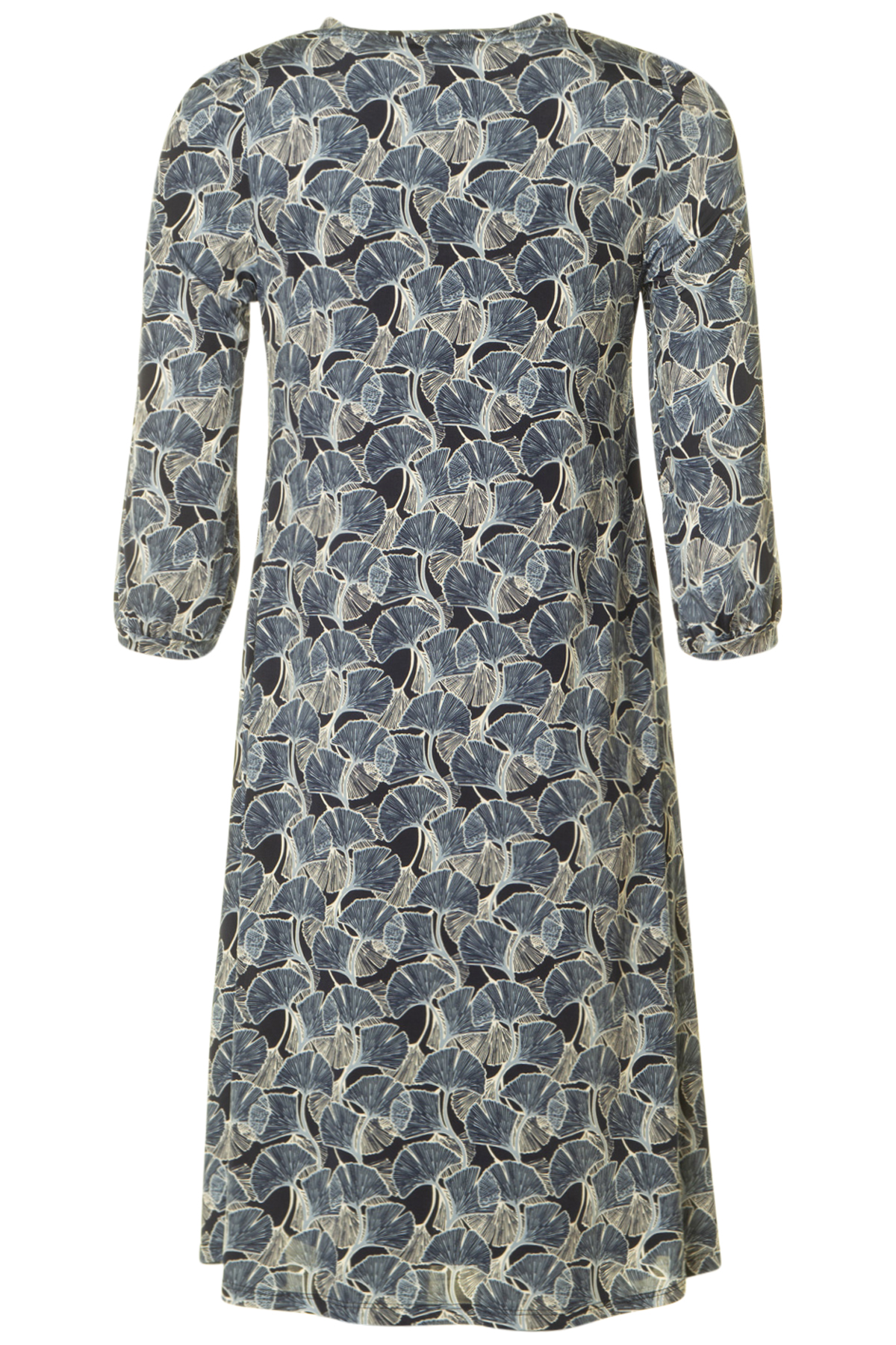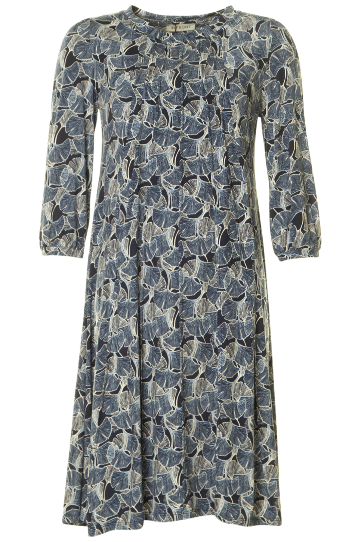 Klänning med 3/4-ärm från In Front. Klänningen har rund hals med med lagda veck, som fortsätter i sydda veck ner på klänningen.