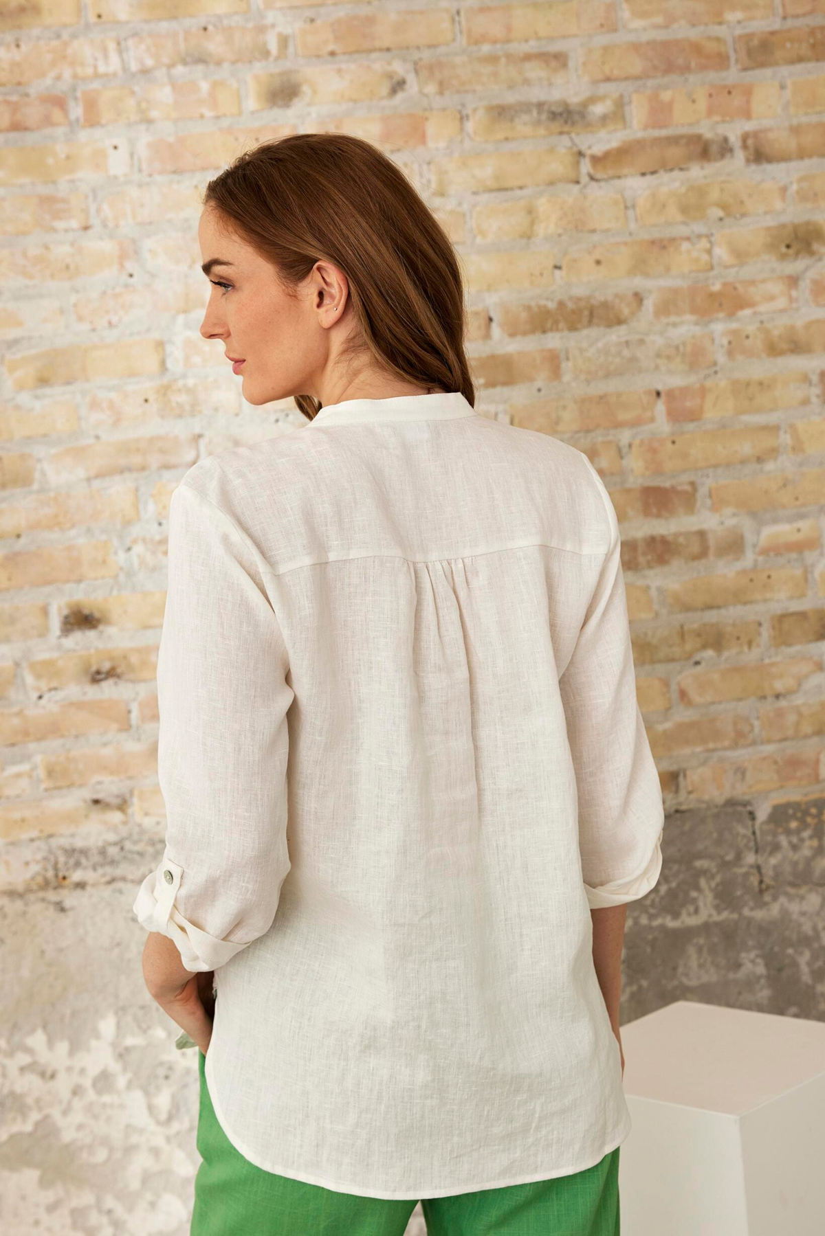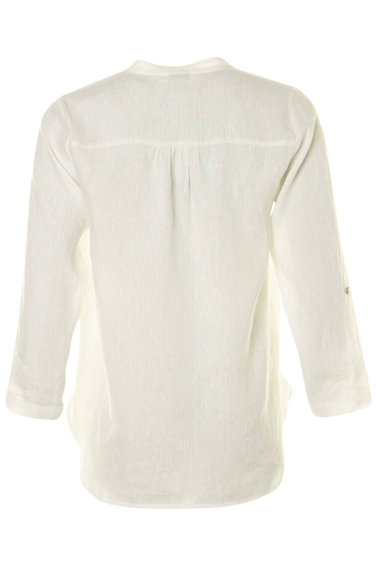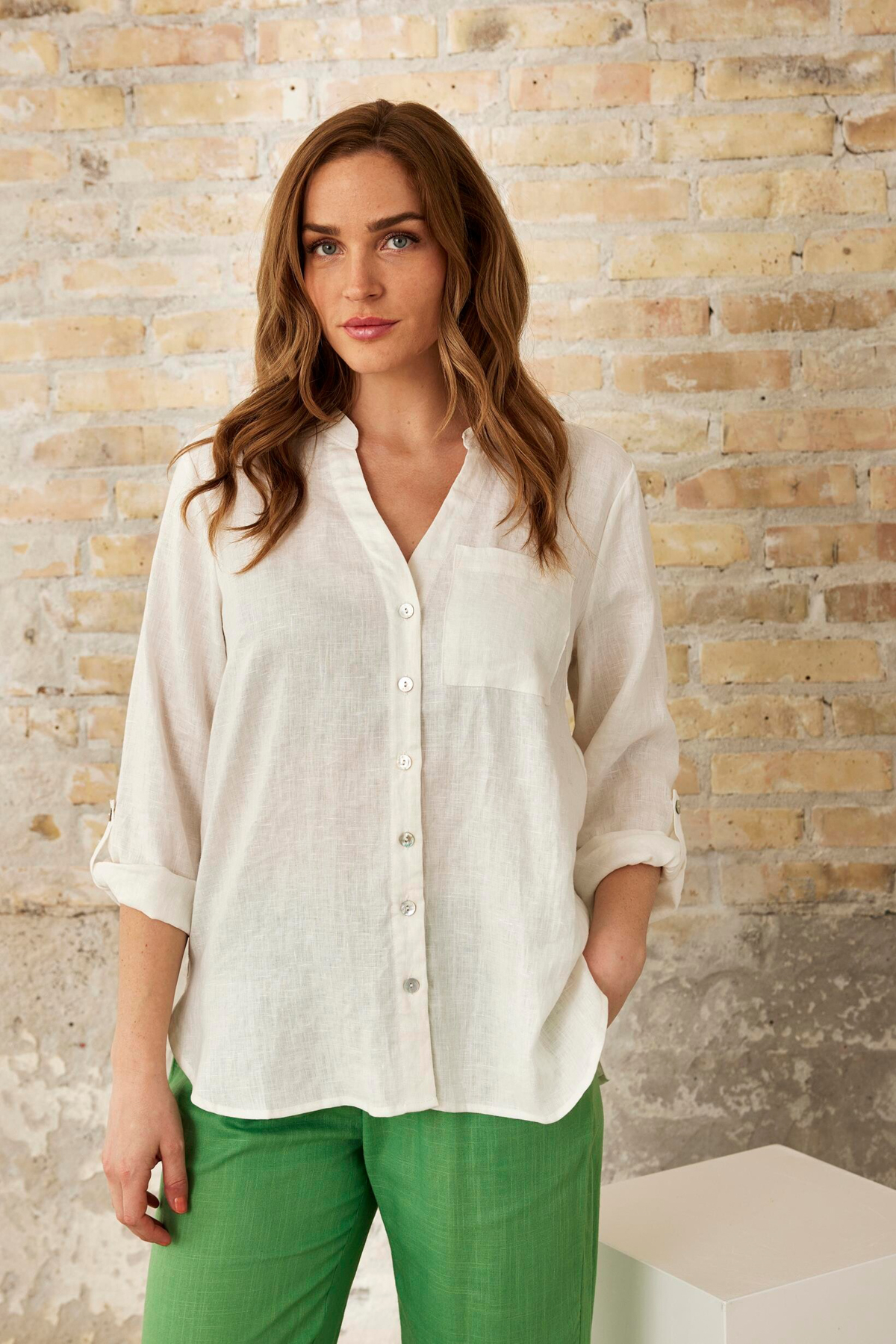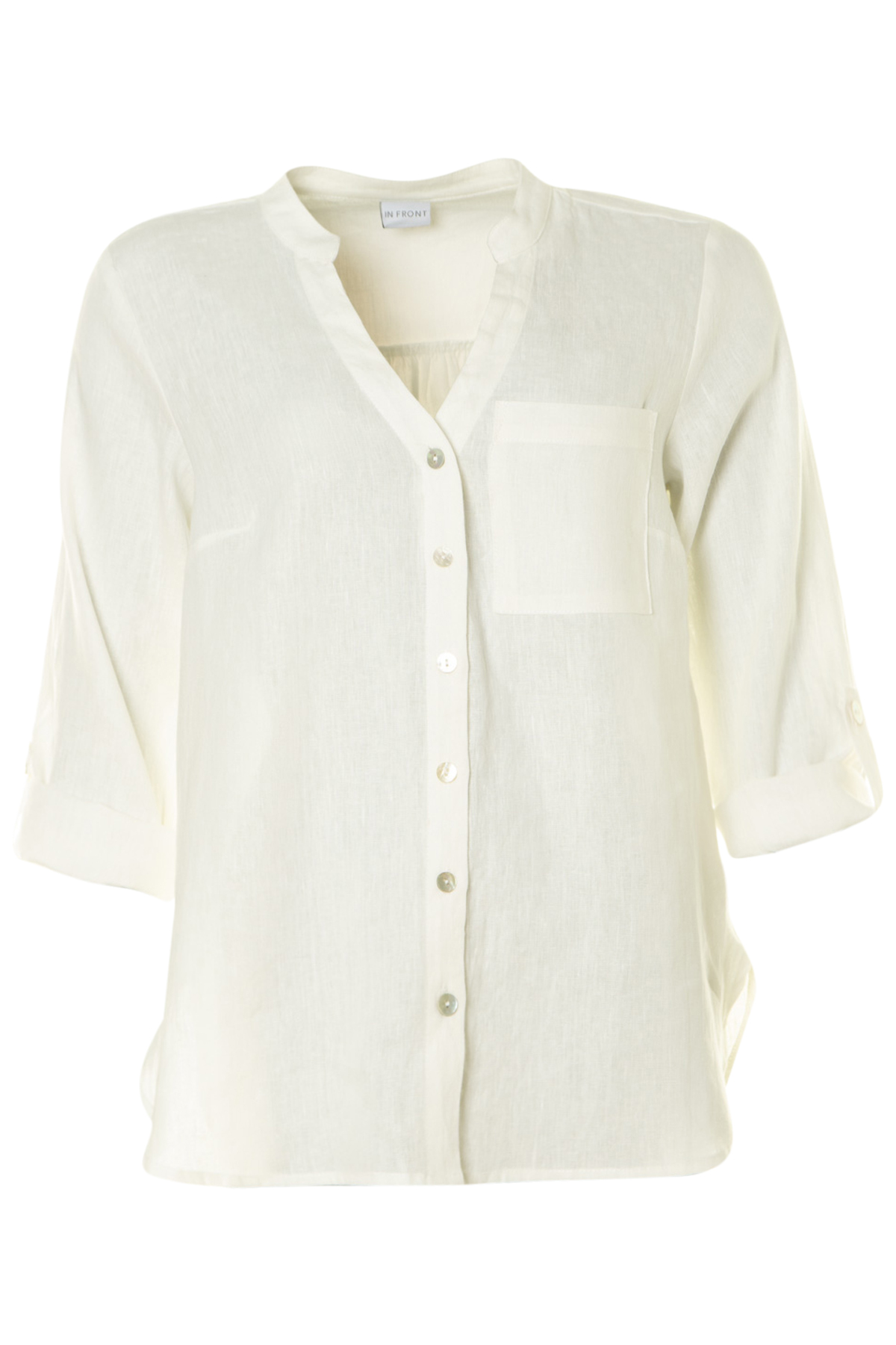 En elegant Linneskjorta från In Front med V-ringning och ståkrage. Skjortan har sex pärlemorknappar fram, är rak i modellen och har 7/8-ärm med med påsydd slejf och knapp för att kunna vika upp och korta ärmar.
