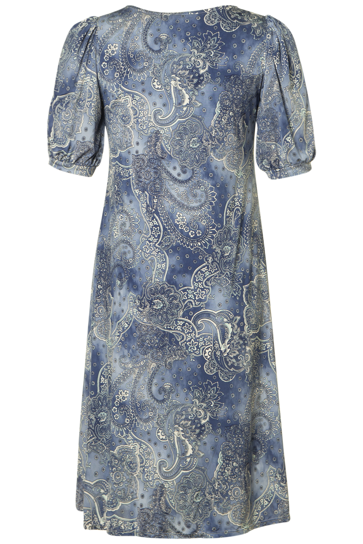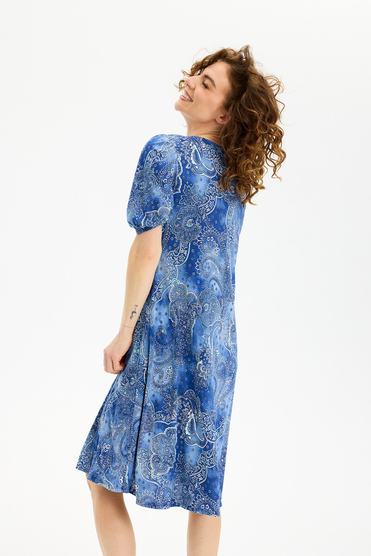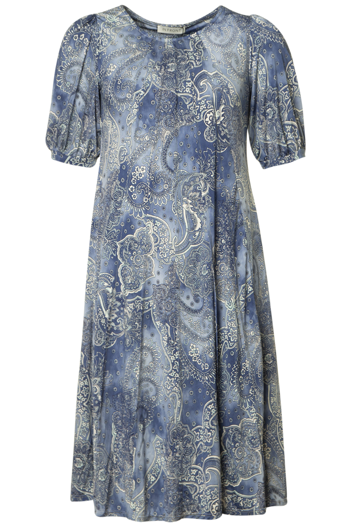 In Front Lucette Klänning Greece, en mönstrad klänning med kort puffärm från In Front. Klänningen är något figursydd med mer vidd nedtill. Den har dekorativa sydda veck på framsidan från halsringningen och neråt.