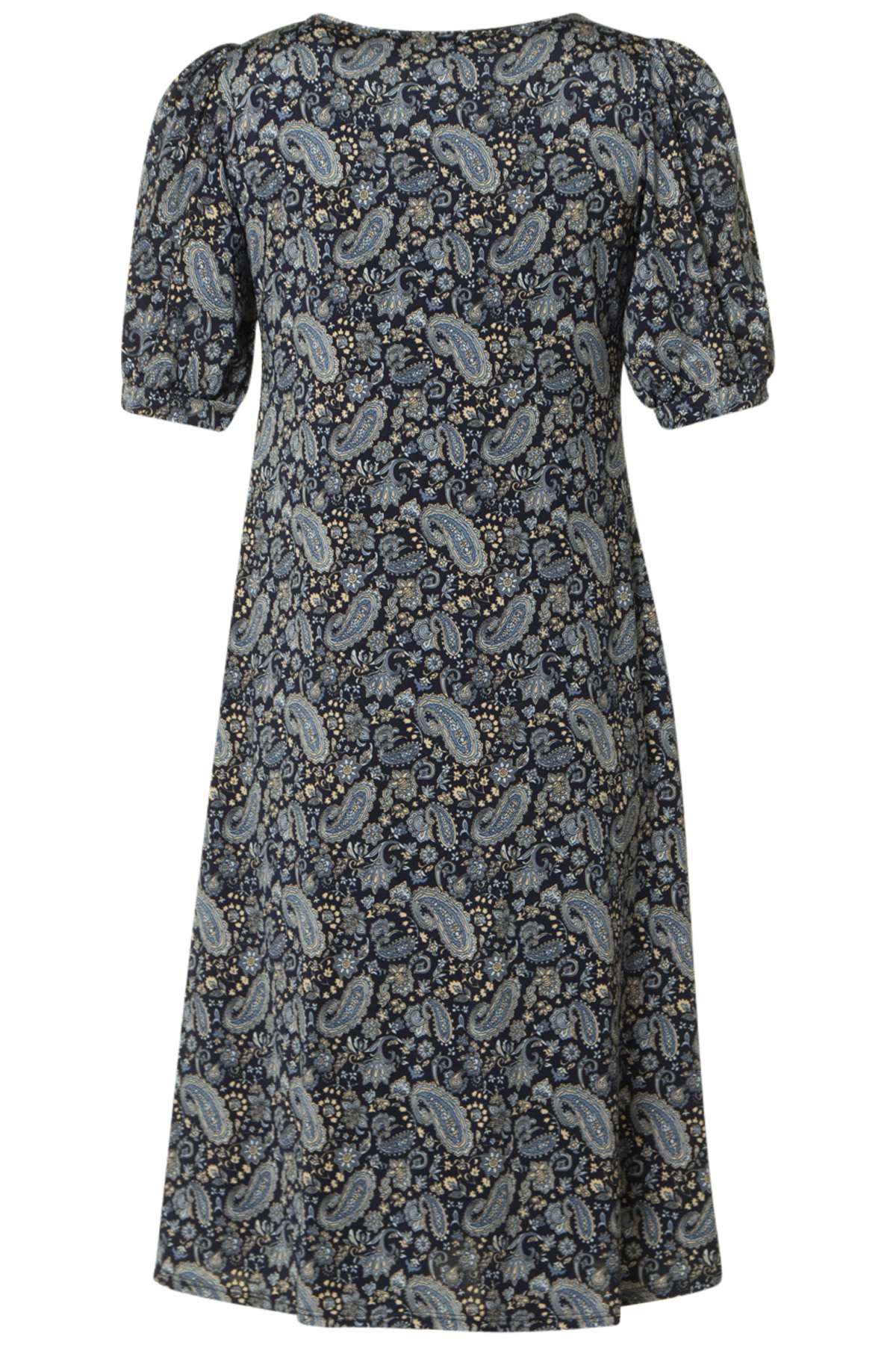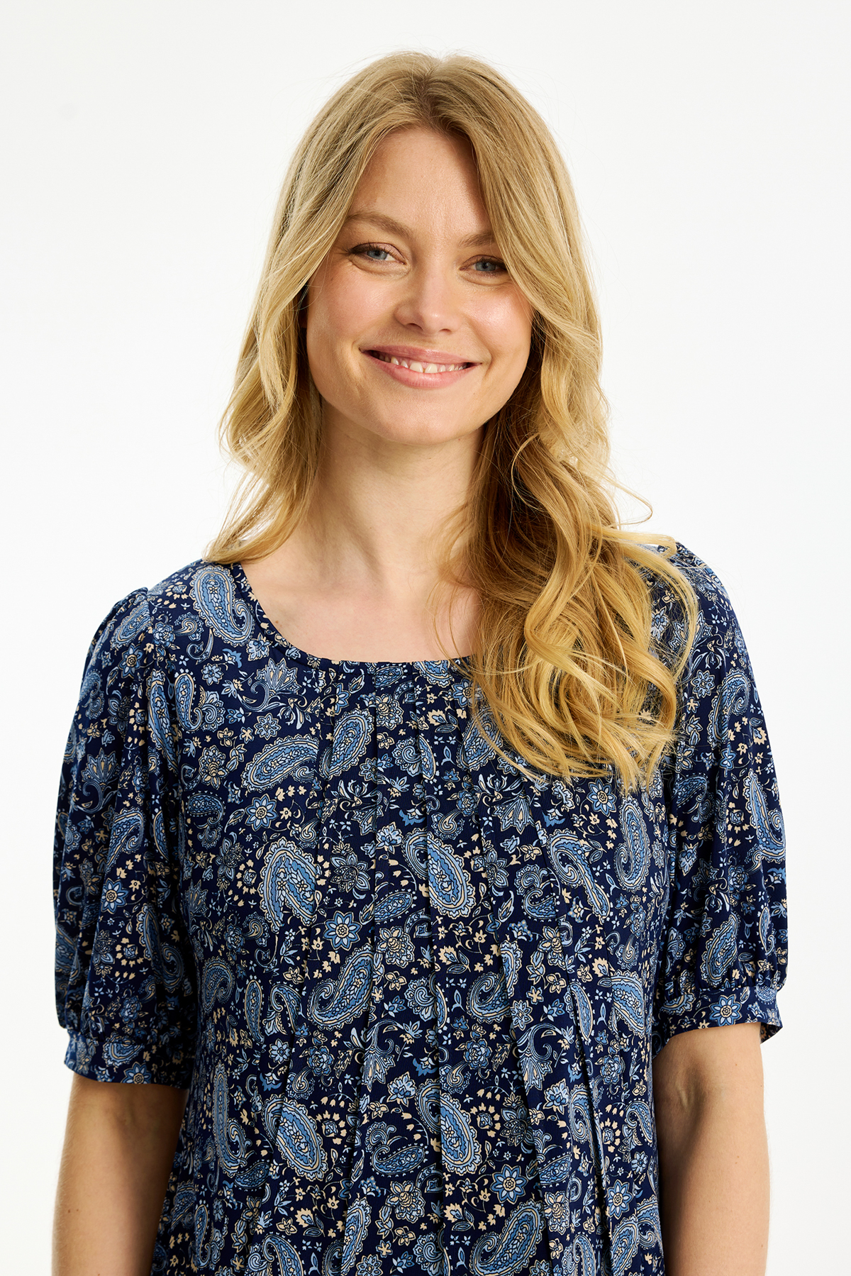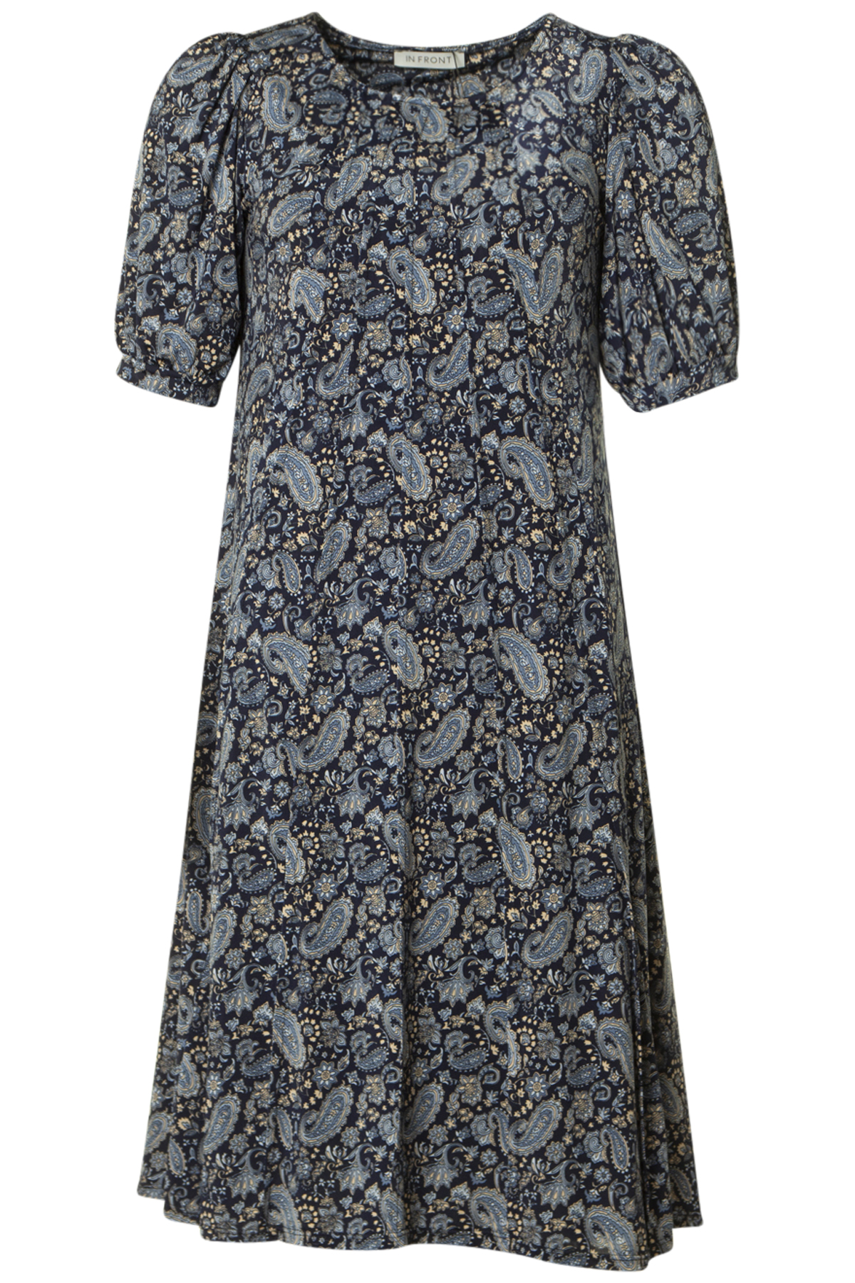 In Front Lucette Klänning Maddie, en mönstrad klänning med kort puffärm från In Front. Klänningen är något figursydd med mer vidd nedtill. Den har dekorativa sydda veck på framsidan från halsringningen och neråt.