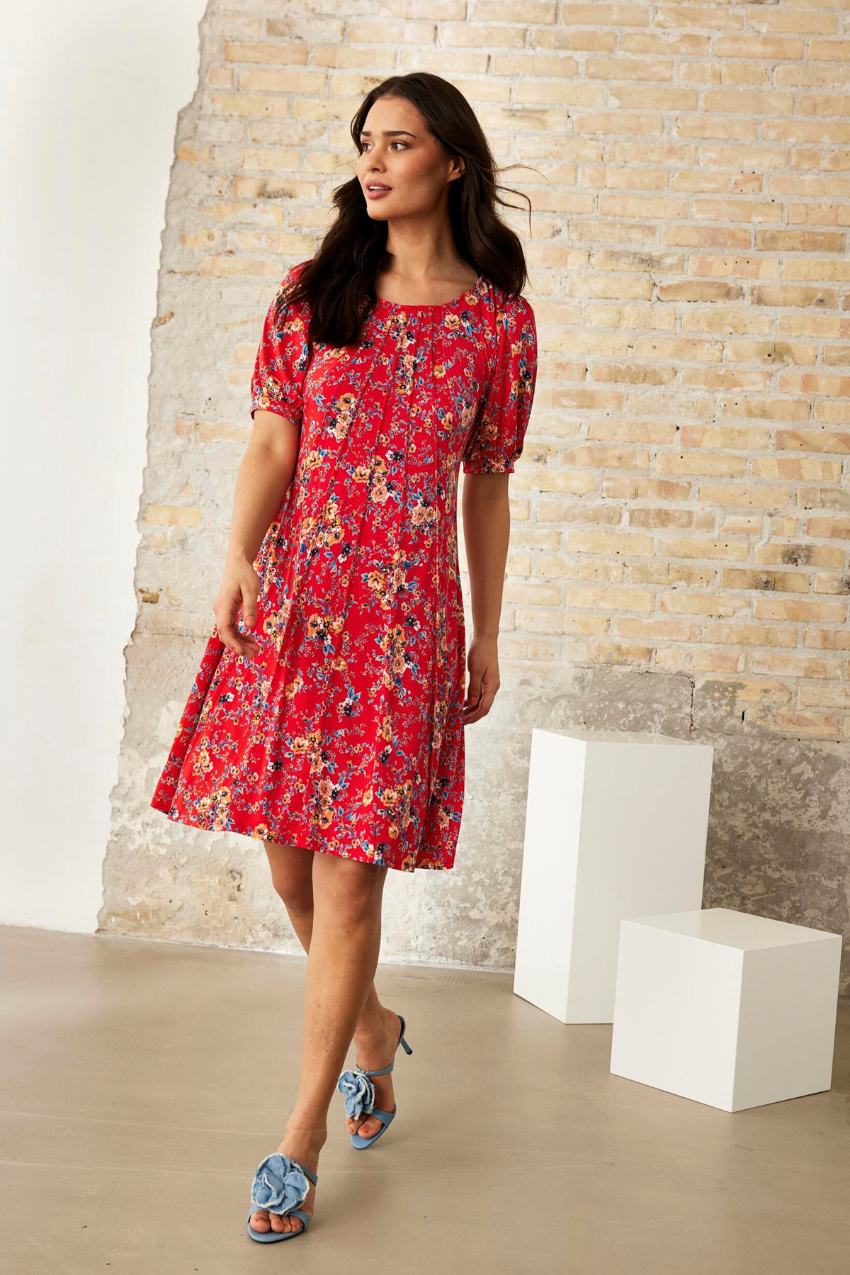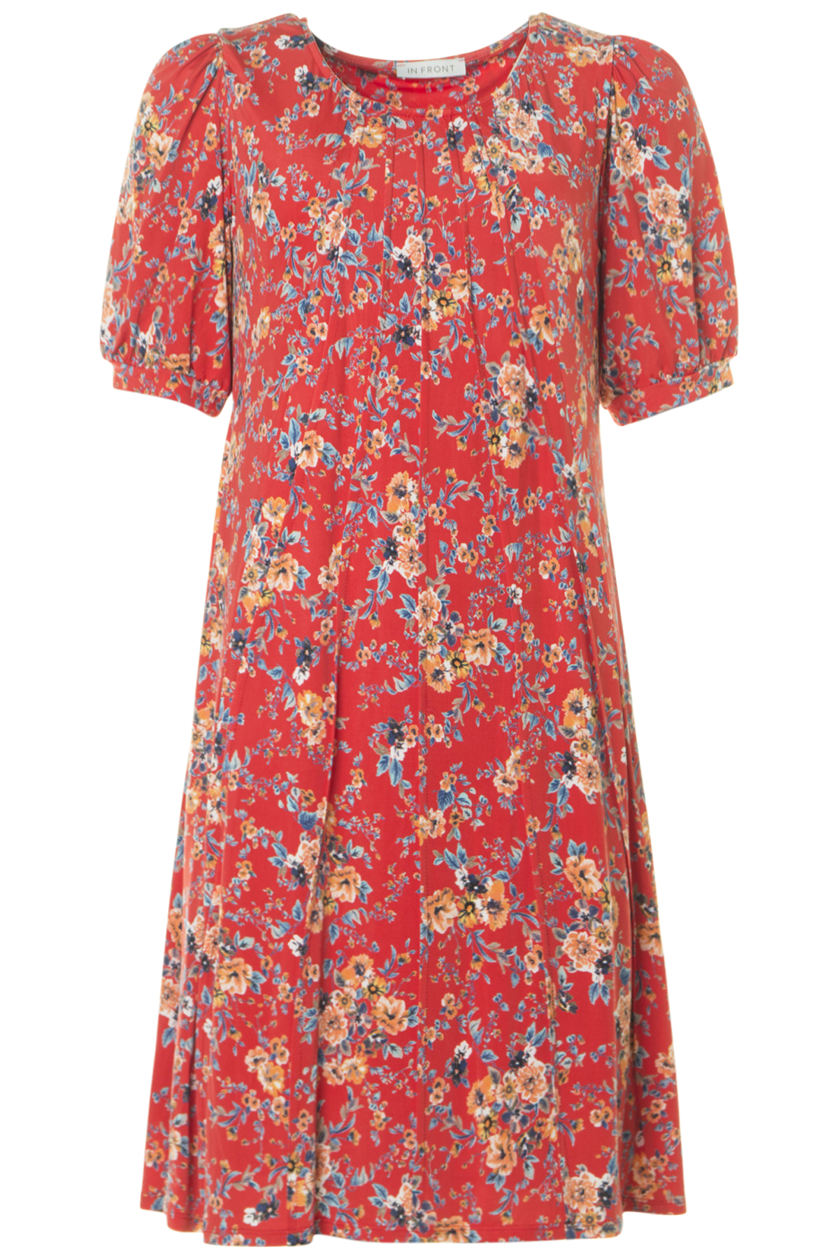 Mönstrad klänning med kort puffärm från In Front. Klänningen är något figursydd med mer vidd nedtill och normal i passformen.