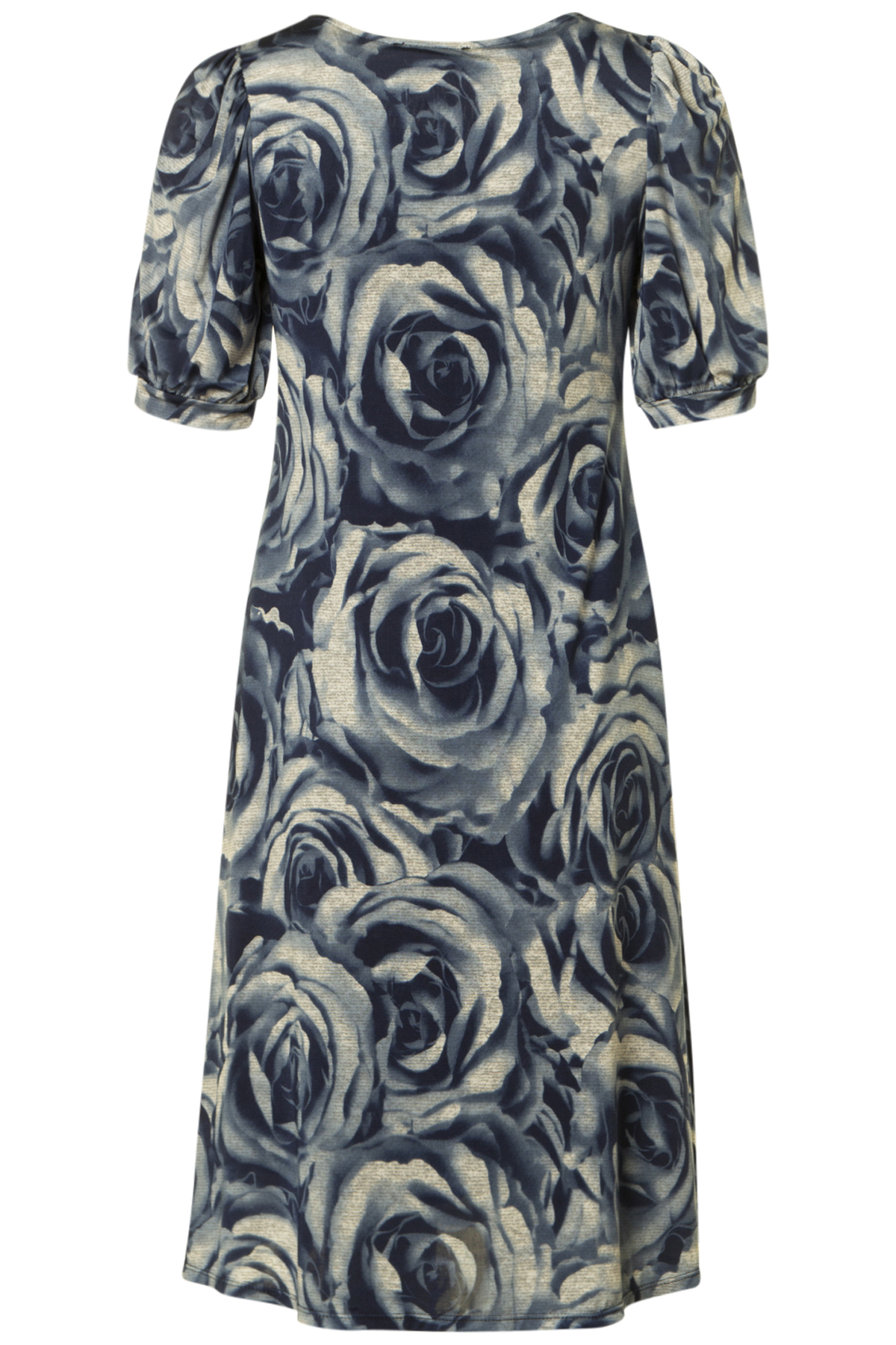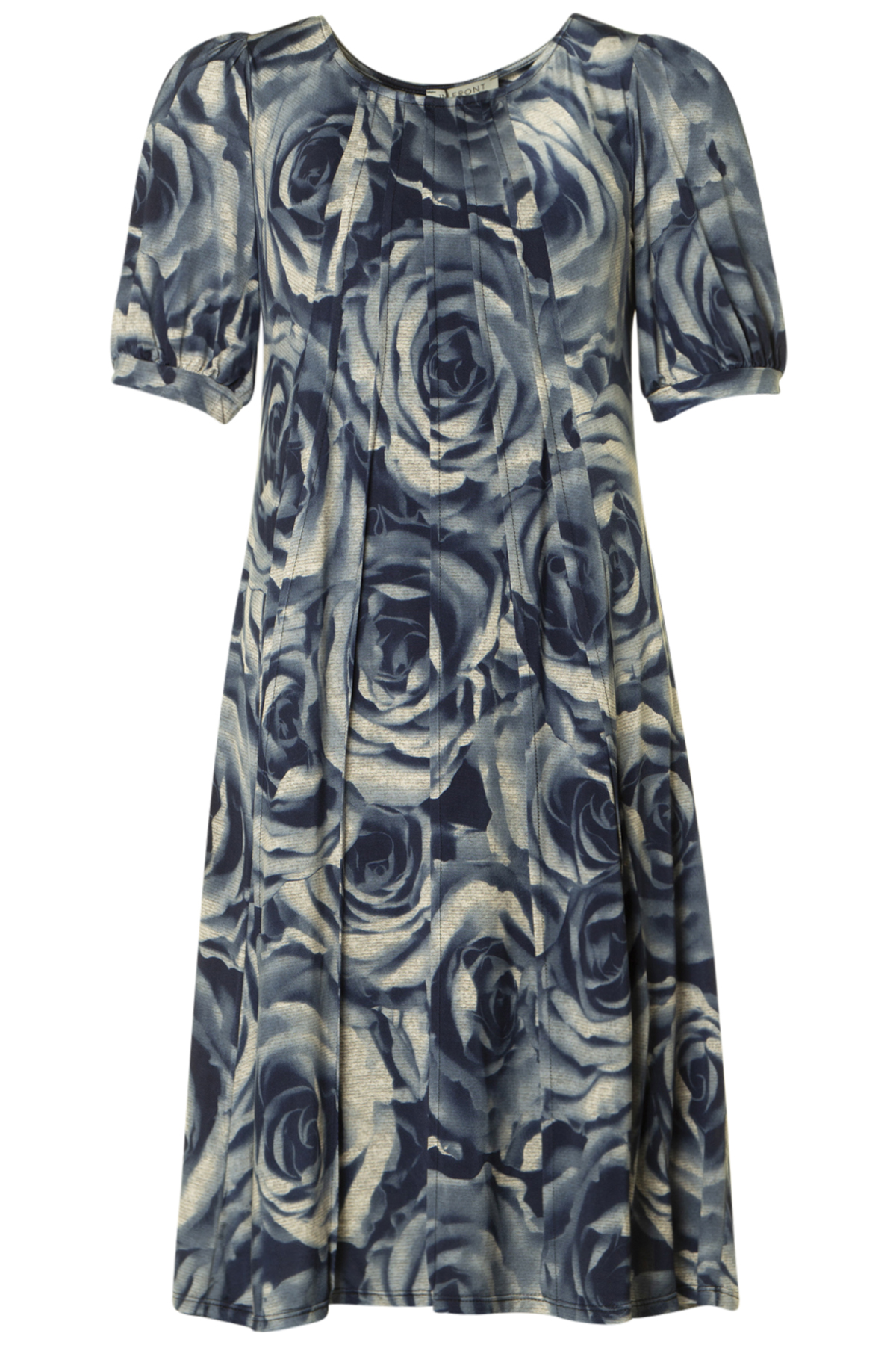 In Front Lucette Klänning Rose, en mönstrad klänning med kort puffärm från In Front. Klänningen är något figursydd med mer vidd nedtill. Den har dekorativa sydda veck på framsidan från halsringningen och neråt.