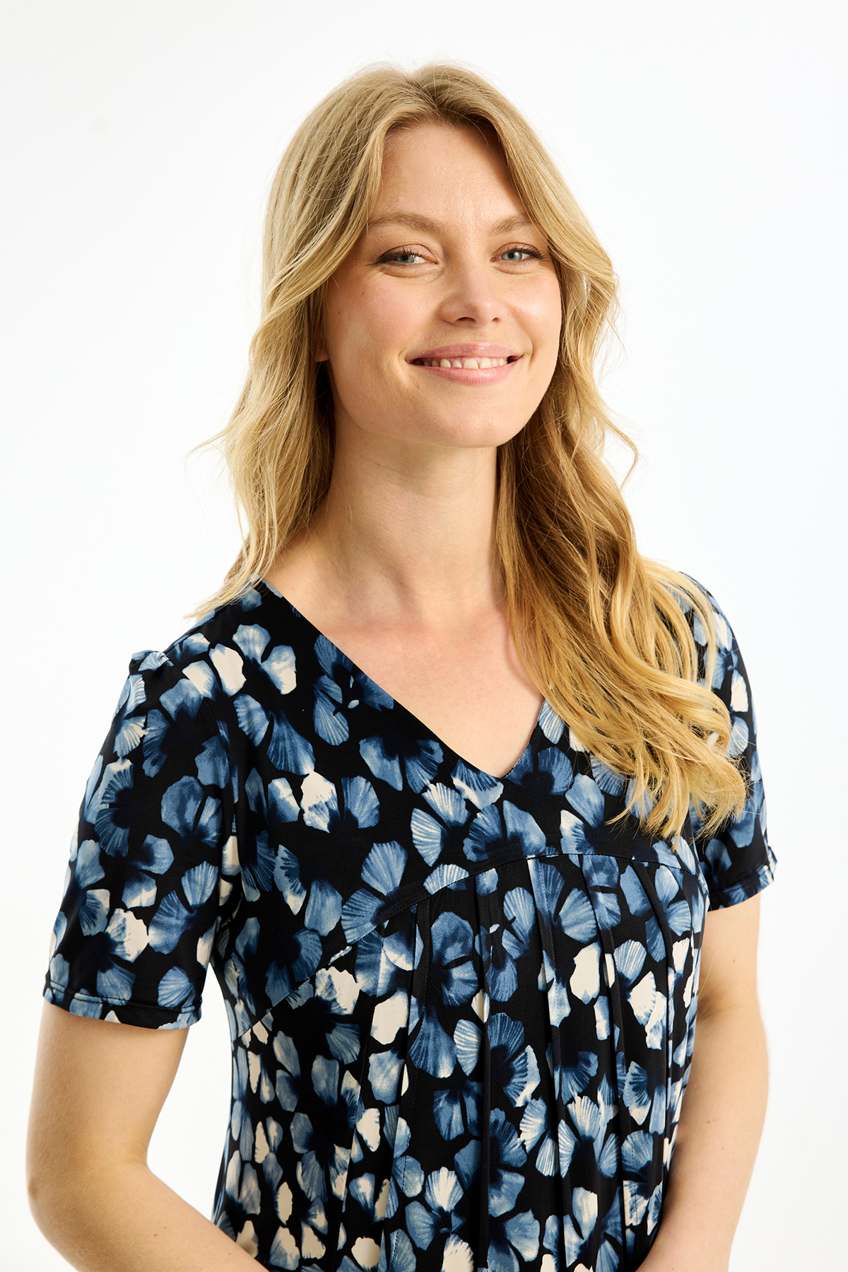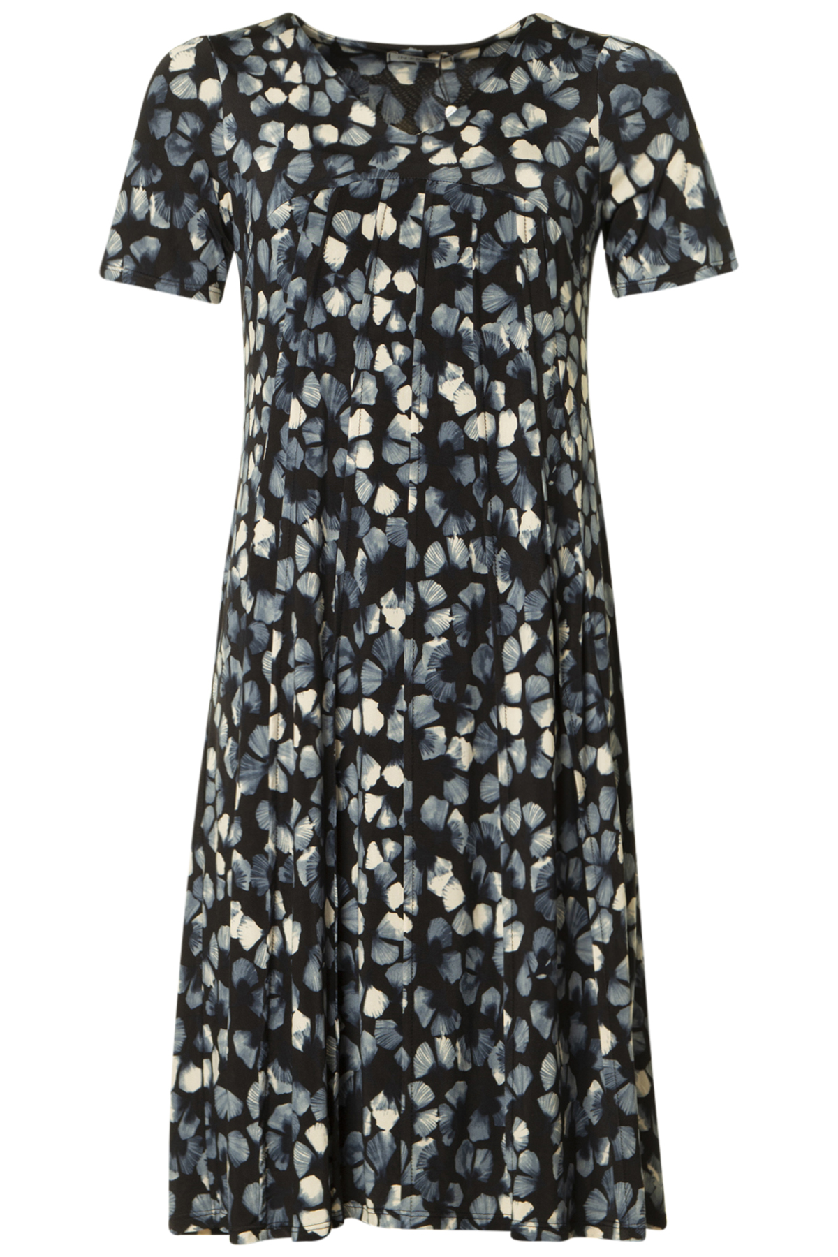 In Front Lucy Klänning Azur, en mönstrad klänning med kort ärm från In Front. Klänningen är A-formad med mer vidd nedtill. Den är V-ringad och avskuren över bysten med dekorativa sydda veck på framsidan från skärningen och neråt.