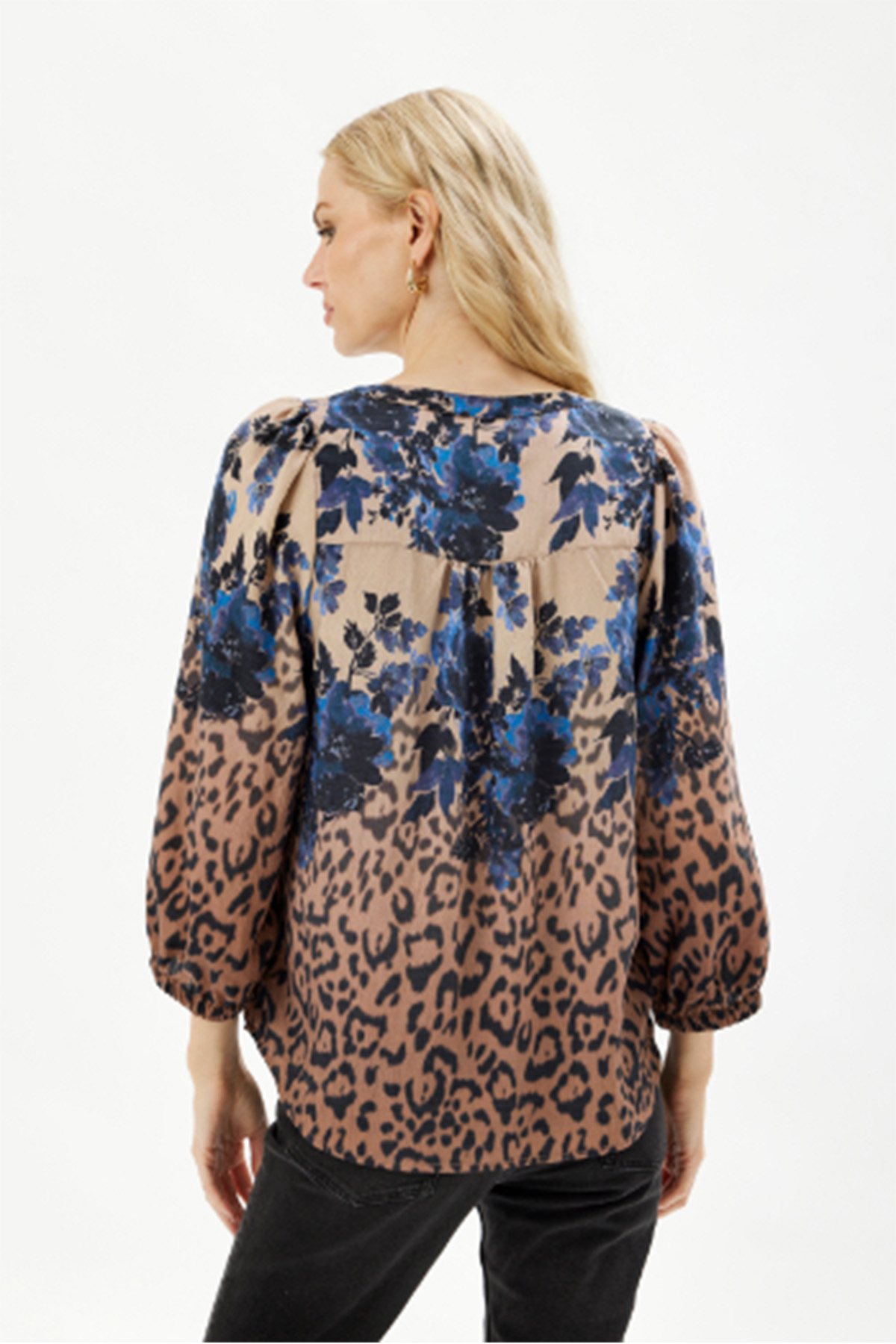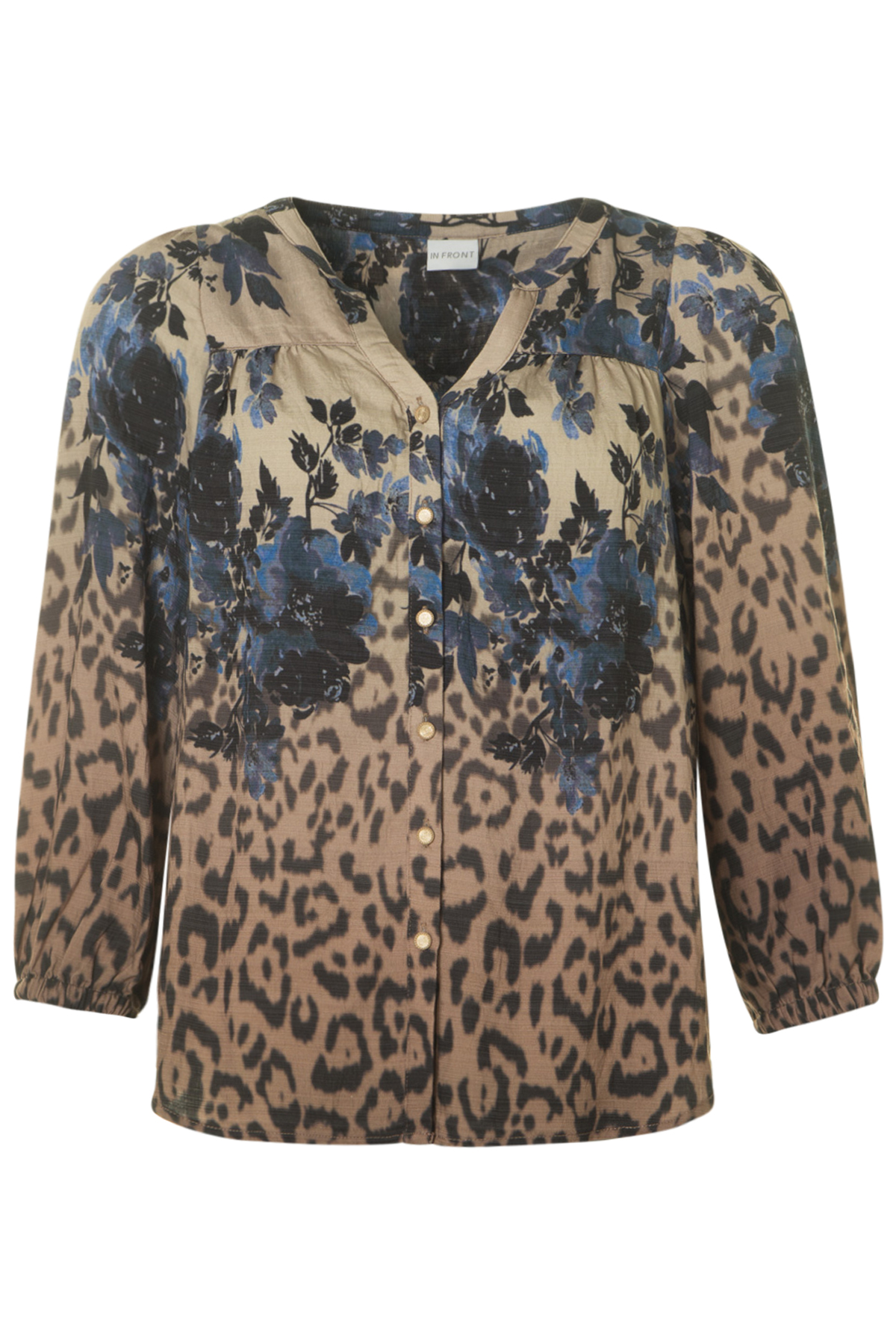 En elegant blus med 7/8-ärm och smal ståkrage från In Front. Blusen är rak i modellen och lös i passformen och har resår vid ärmsluten. Den är V-ringad och knäpps fram med sex guldfärgade dekorativa knappar.