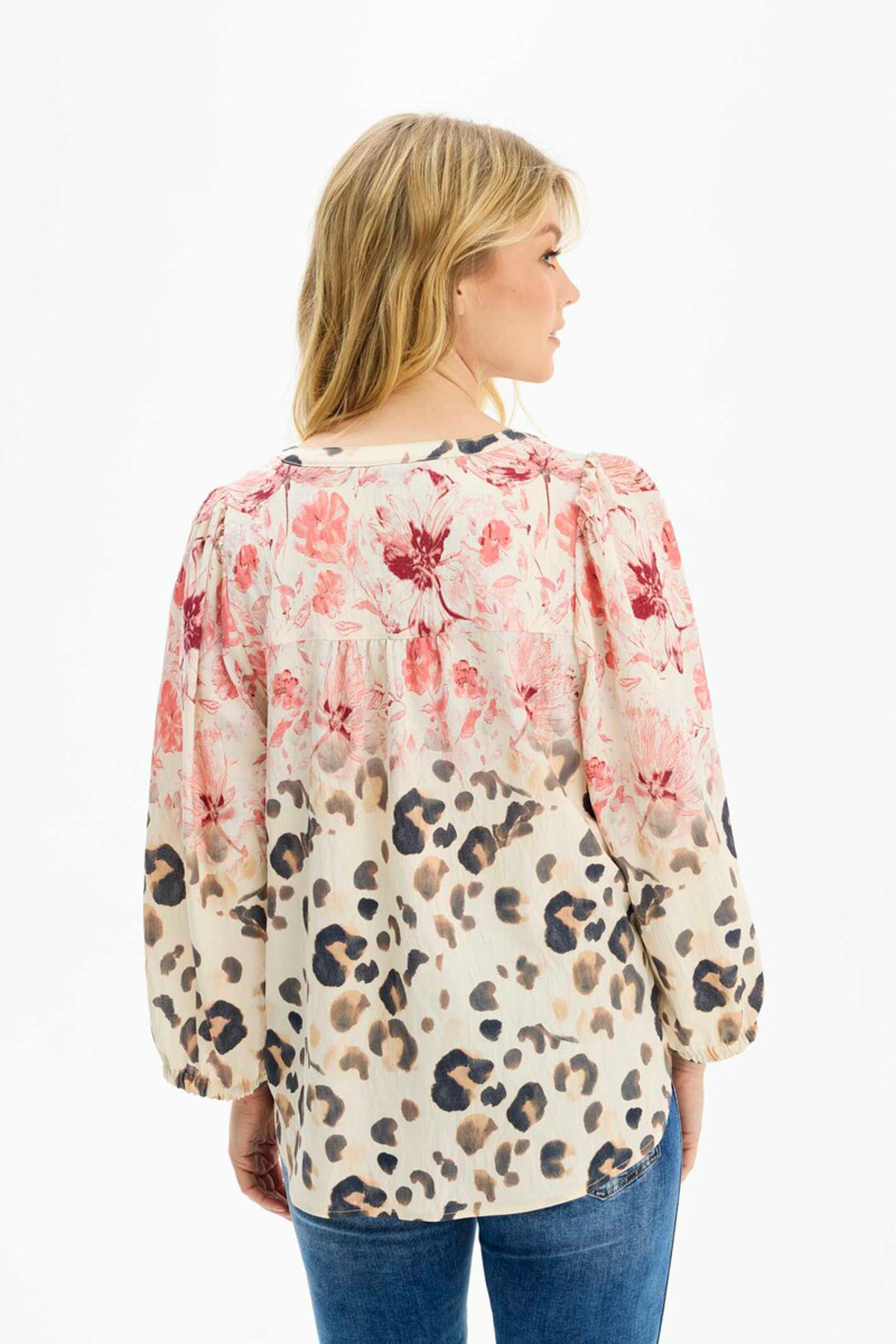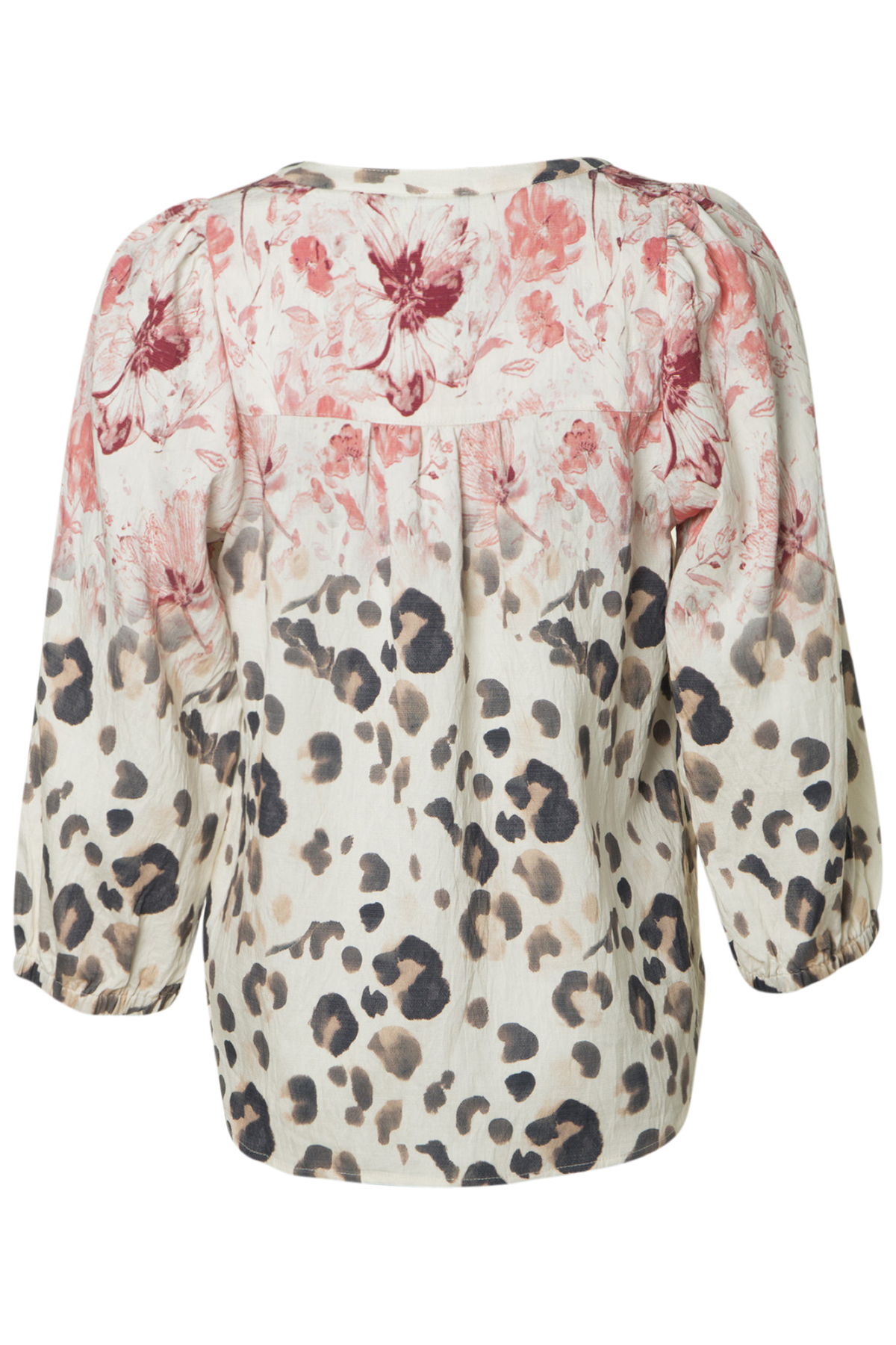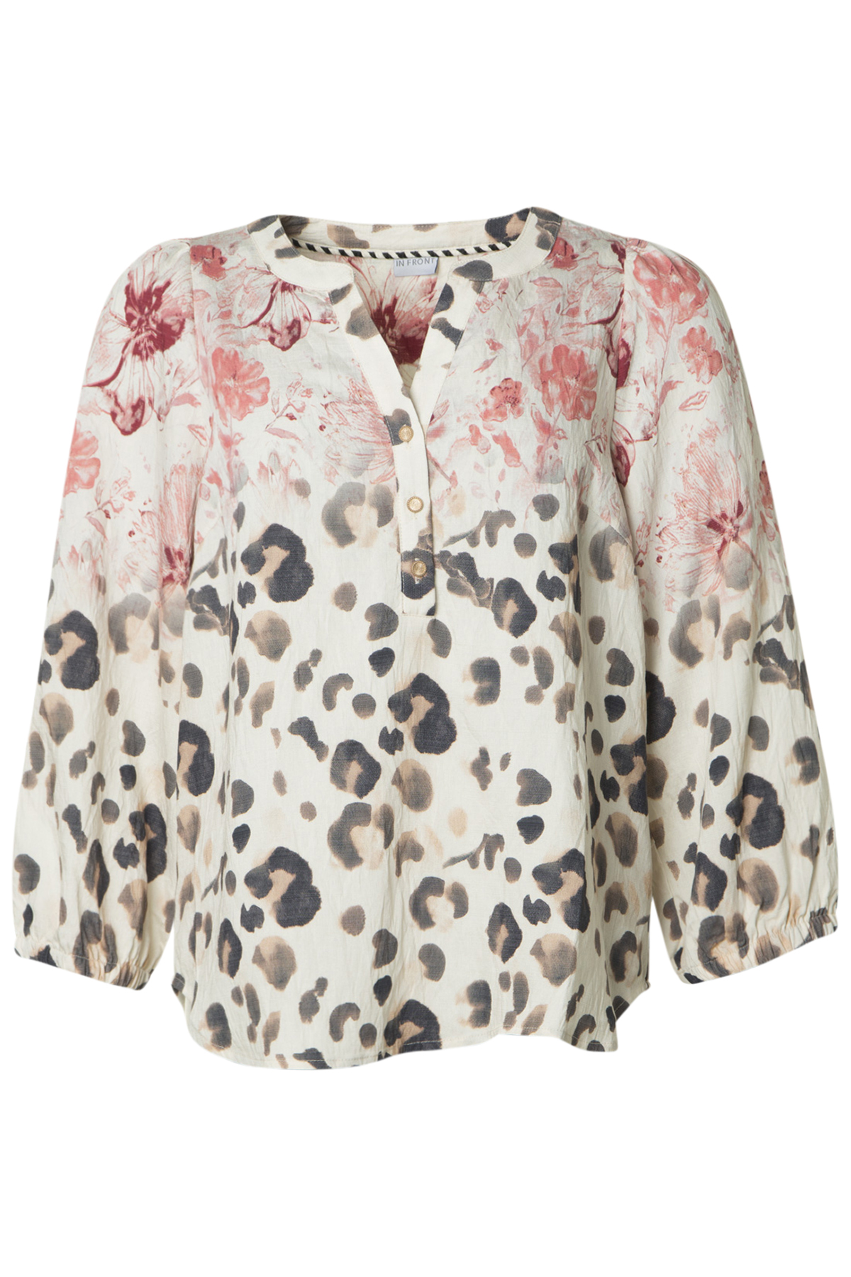 In Front Mona Blus Jenae, är en vacker blus med V-hals och en smal ståkrage. Blusen är rak i modellen och lös i passformen med ett sprund fram som knäpps med tre dekorativa knappar. Den har vida 3/4-långa puffärmar med resår nedtill och är tillverkad av en sval viskos-mix.