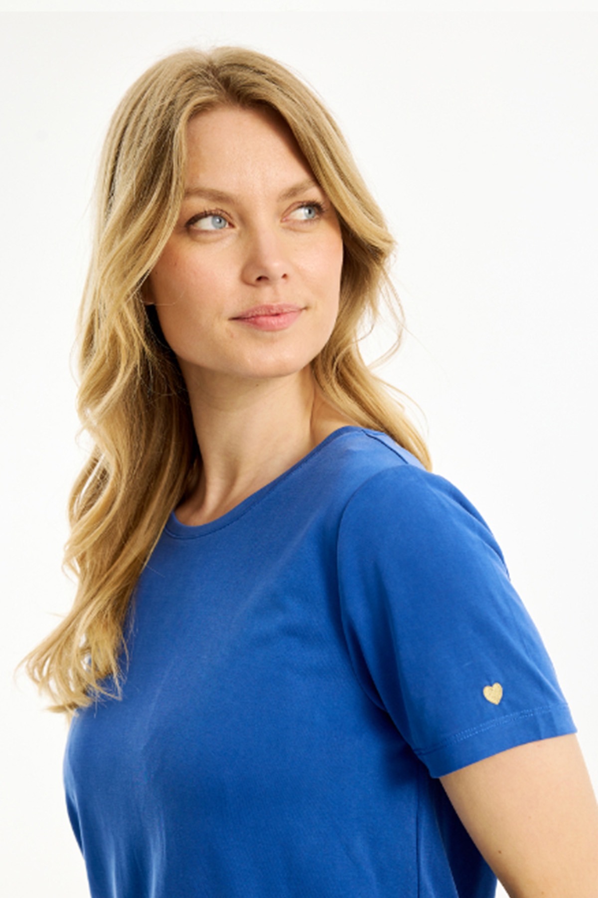 Den har ett guldfärgat hjärta på vänster ärm och är tillverkad i ett stretchigt trikåmaterial som känns härligt mot kroppen.