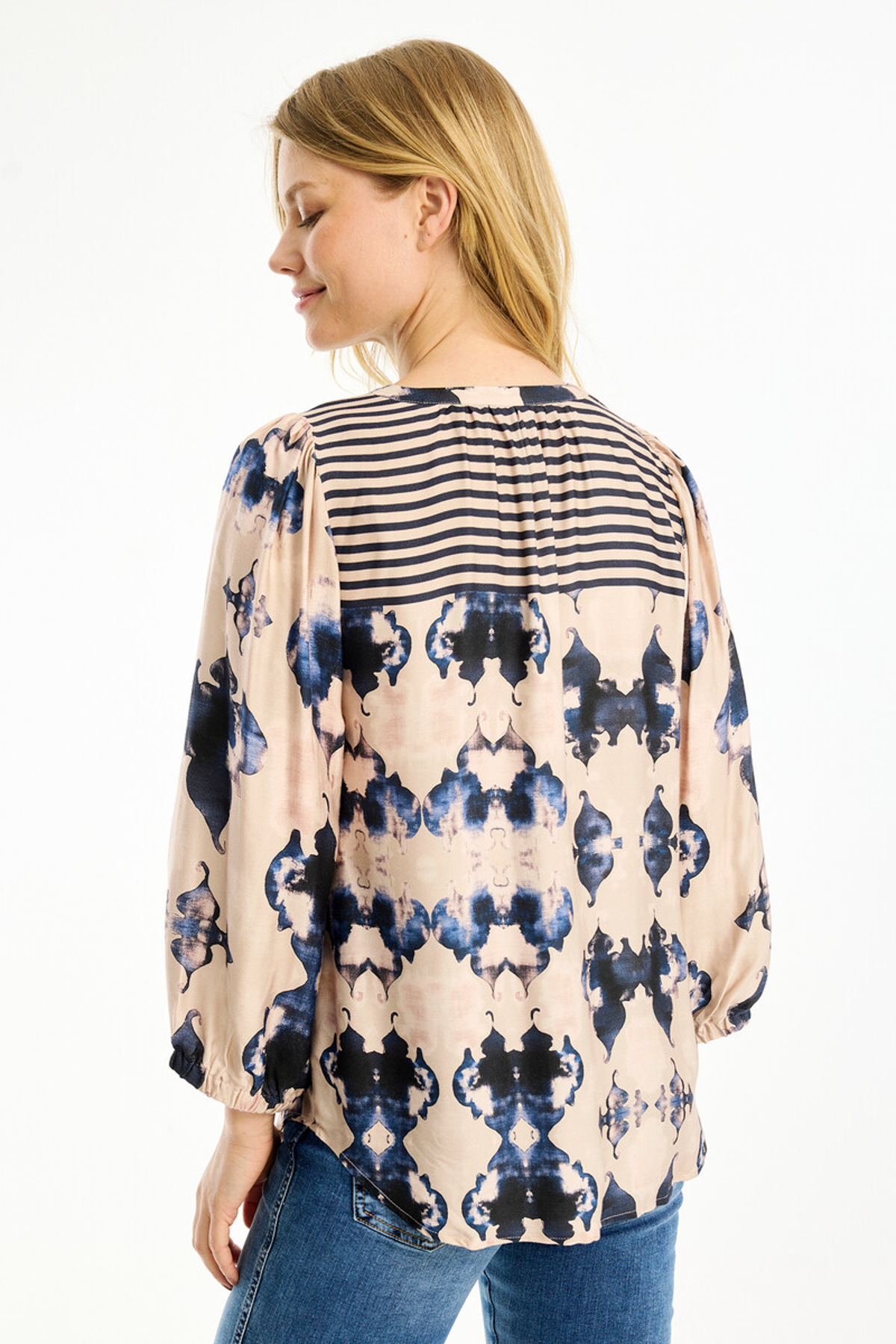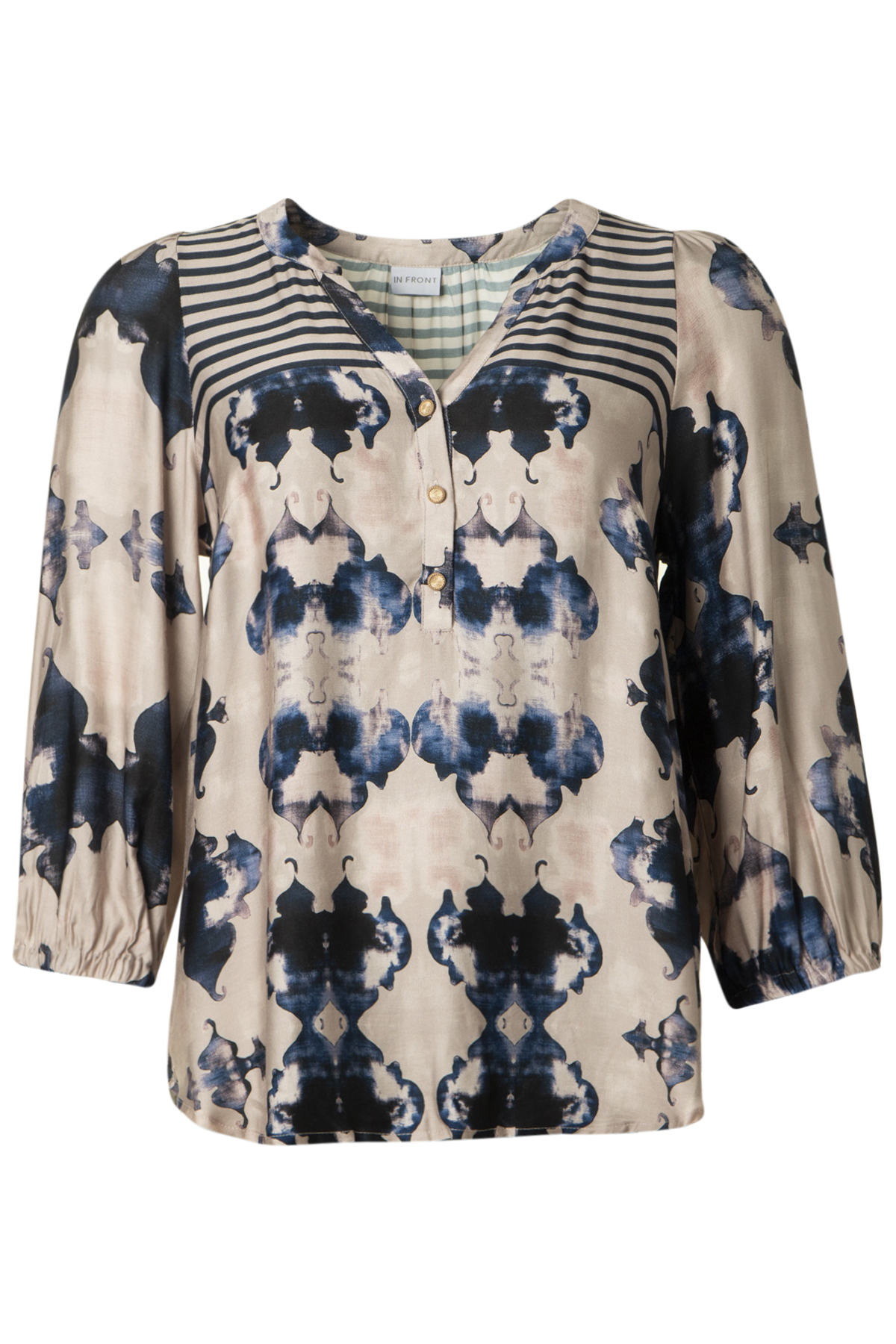 In Front Pil Blus Dunphy är en vacker blus med V-ringning och en smal ståkrage. Blusen är rak i modellen och lös i passformen med ett sprund fram som knäpps med tre dekorativa knappar. Den har vida 3/4-långa puffärmar med resår nedtill och är tillverkad av en sval viskos-mix.