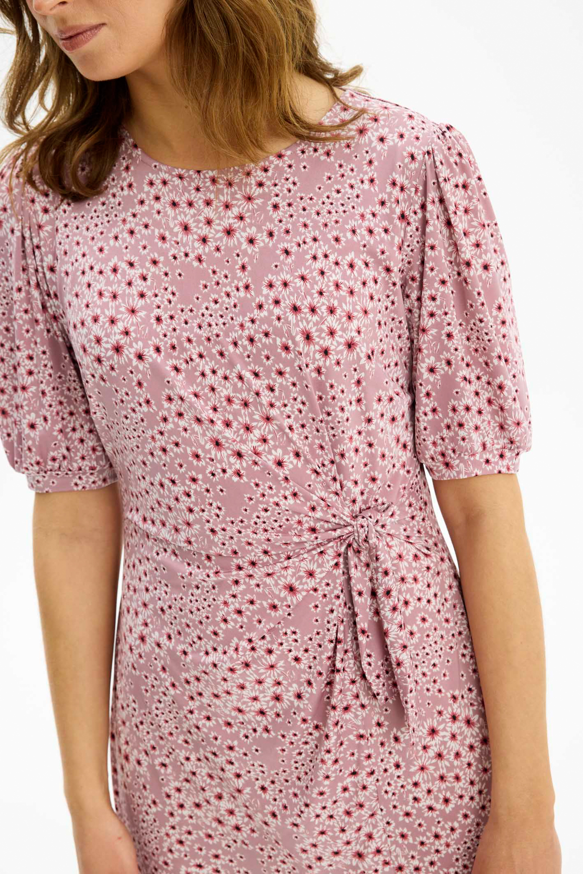 Den har rund halsringning med ett knytband i midjan för en dekorativ draperad detalj, samt en liten slits nertill.