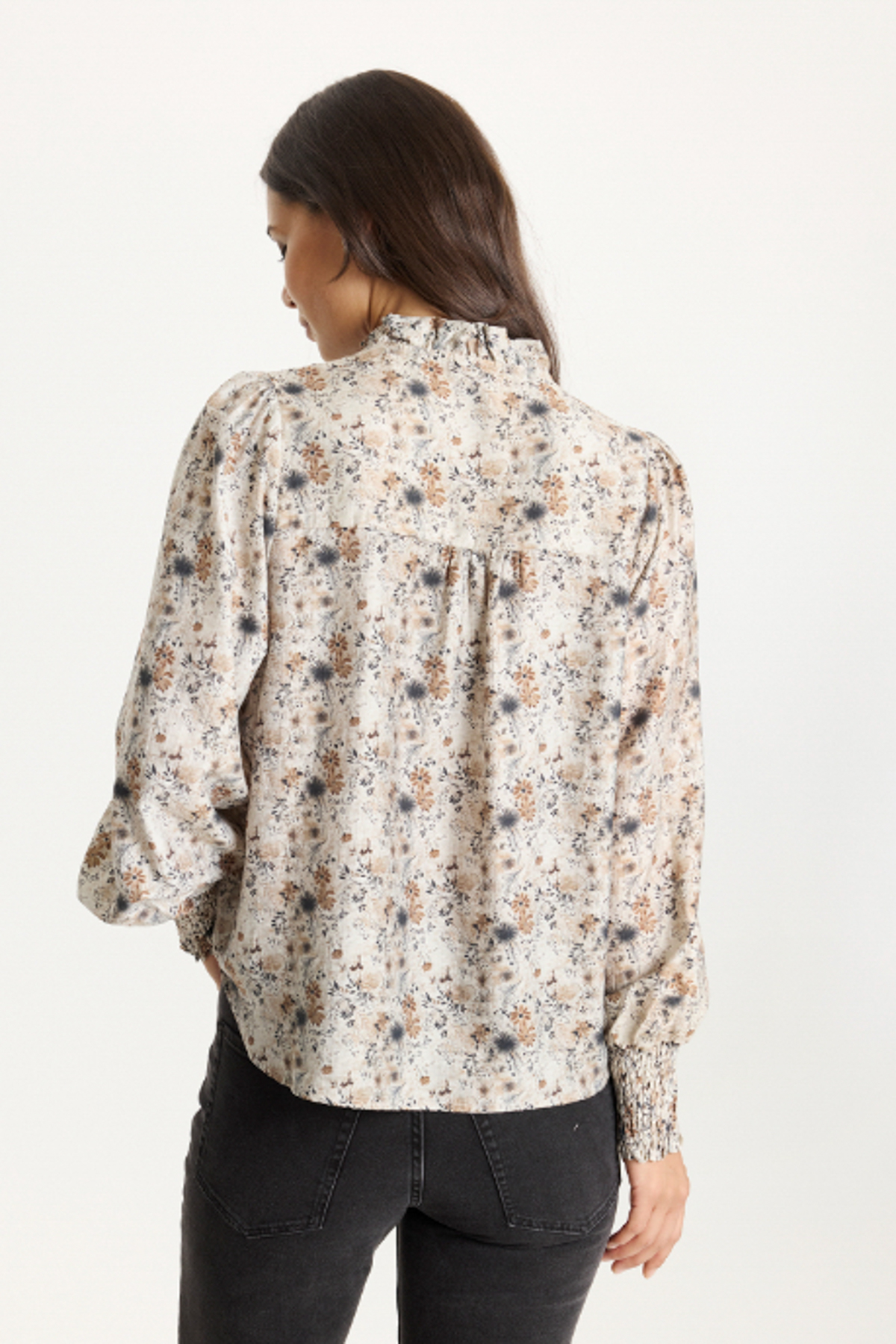 Blusen har en rak modell med lös passform för en bekväm och smickrande silhuett. Den knäpps fram med en guldkantad knapp, och de vida ärmarna avslutas med smockresår vid manschetten som skapar en lätt puffad och elegant effekt.