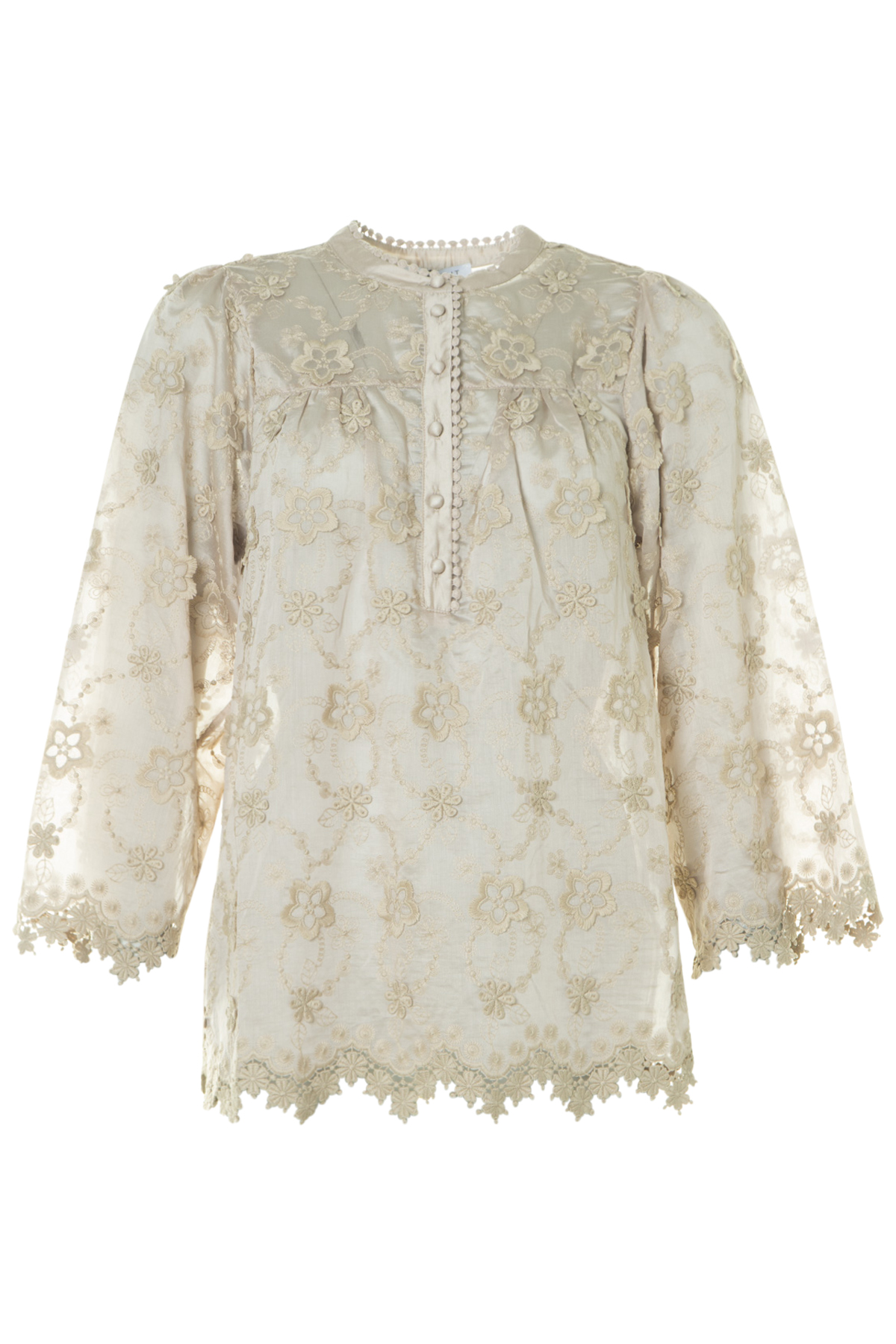 En elegant blus från In Front med rund hals och spetsbroderier. Blusen är rak i modellen och lös i passformen och har vida raka 7/8-ärmar. Den har ett sprund framtill med sex klädda knappar, är något genombruten och tillverkad av mjuk och skön Bomull.