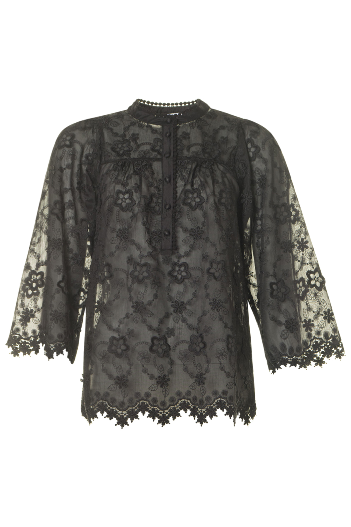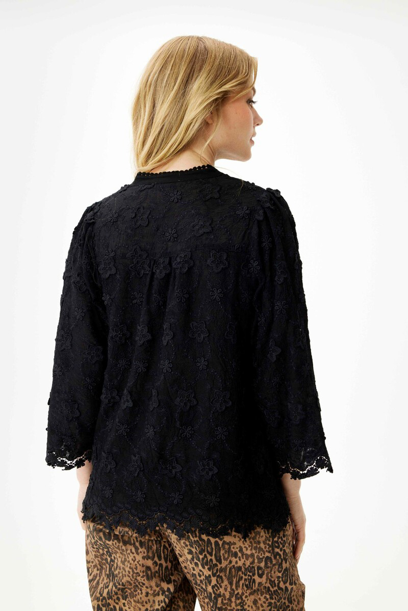 En elegant blus från In Front med rund hals och spetsbroderier. Blusen är rak i modellen och lös i passformen och har vida raka 7/8-ärmar. Den har ett sprund framtill med sex klädda knappar, är... Läs mer...