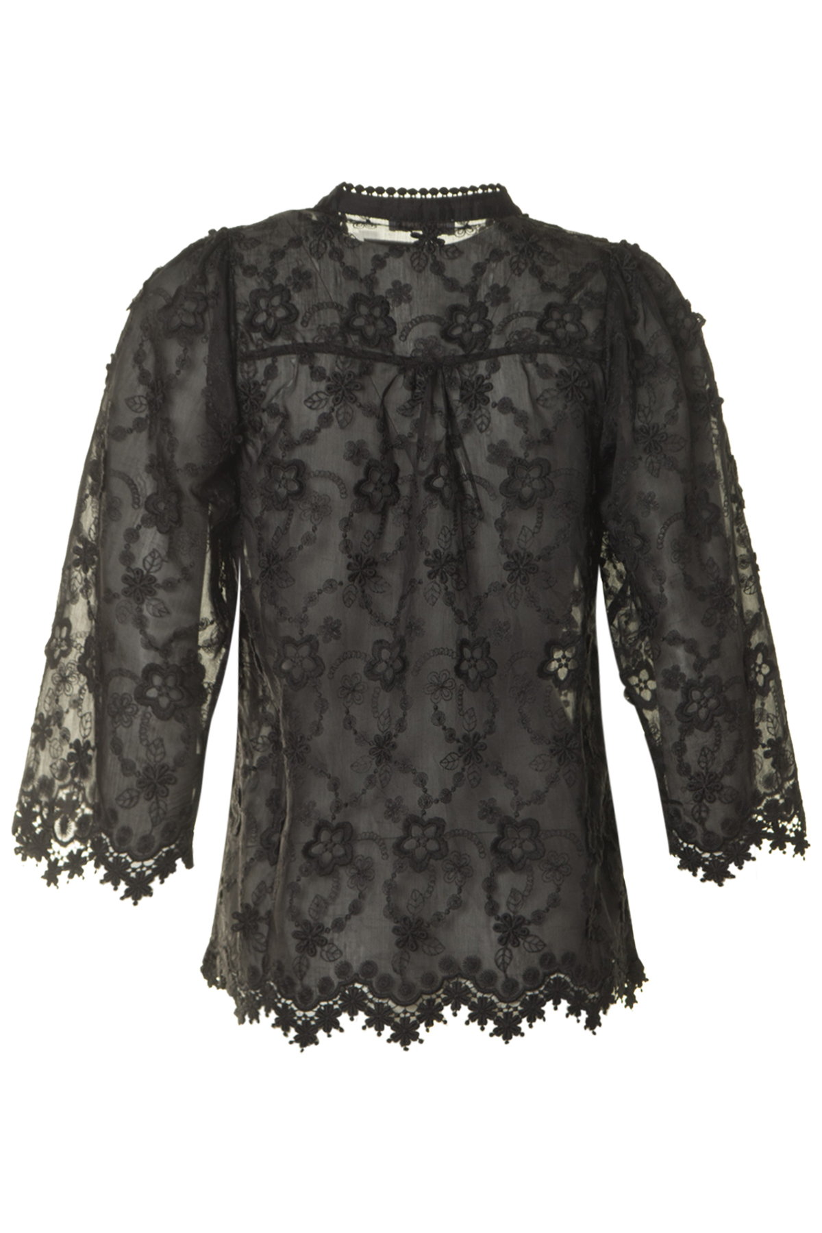 En elegant blus från In Front med rund hals och spetsbroderier. Blusen är rak i modellen och lös i passformen och har vida raka 7/8-ärmar. Den har ett sprund framtill med sex klädda knappar, är något genombruten och tillverkad av mjuk och skön Bomull.