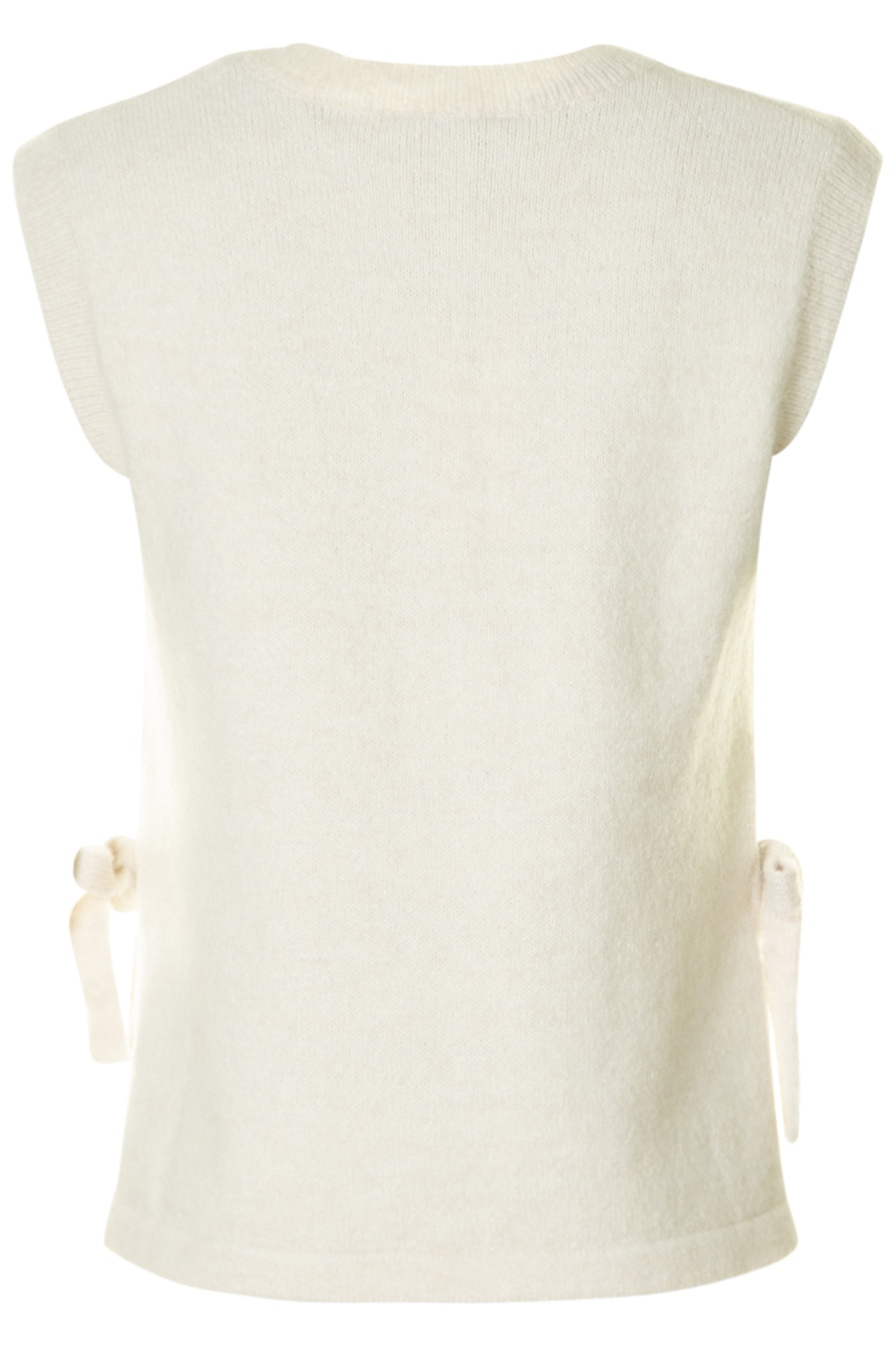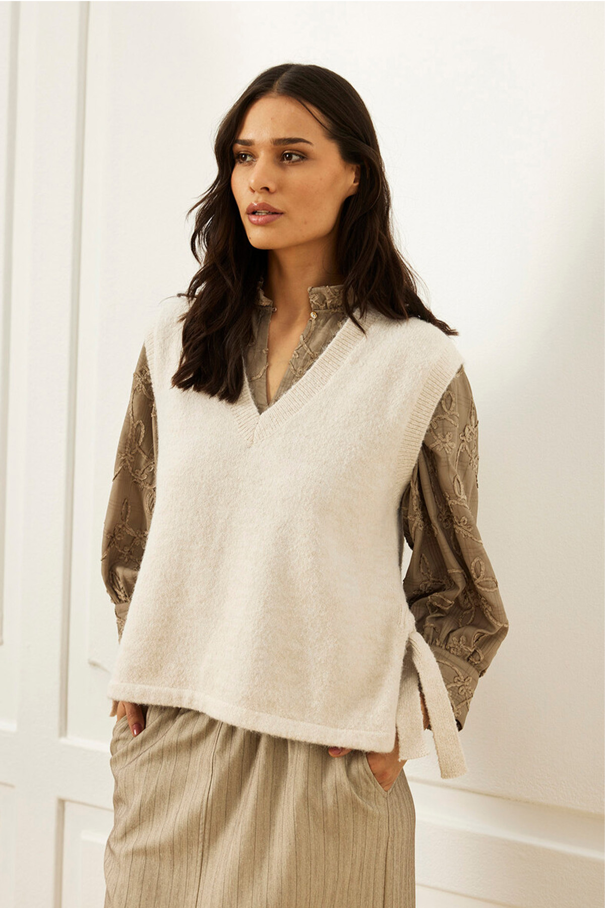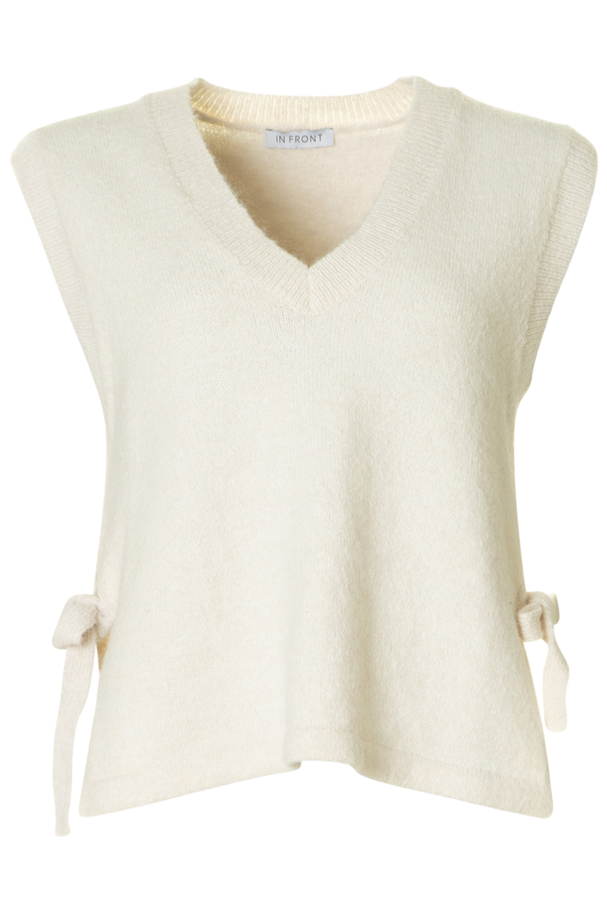 V-ringad stickad väst från In Front. Västen är rak i modellen och normal i passformen. Den har höga sprund i sidorna med ett knytband i midjan