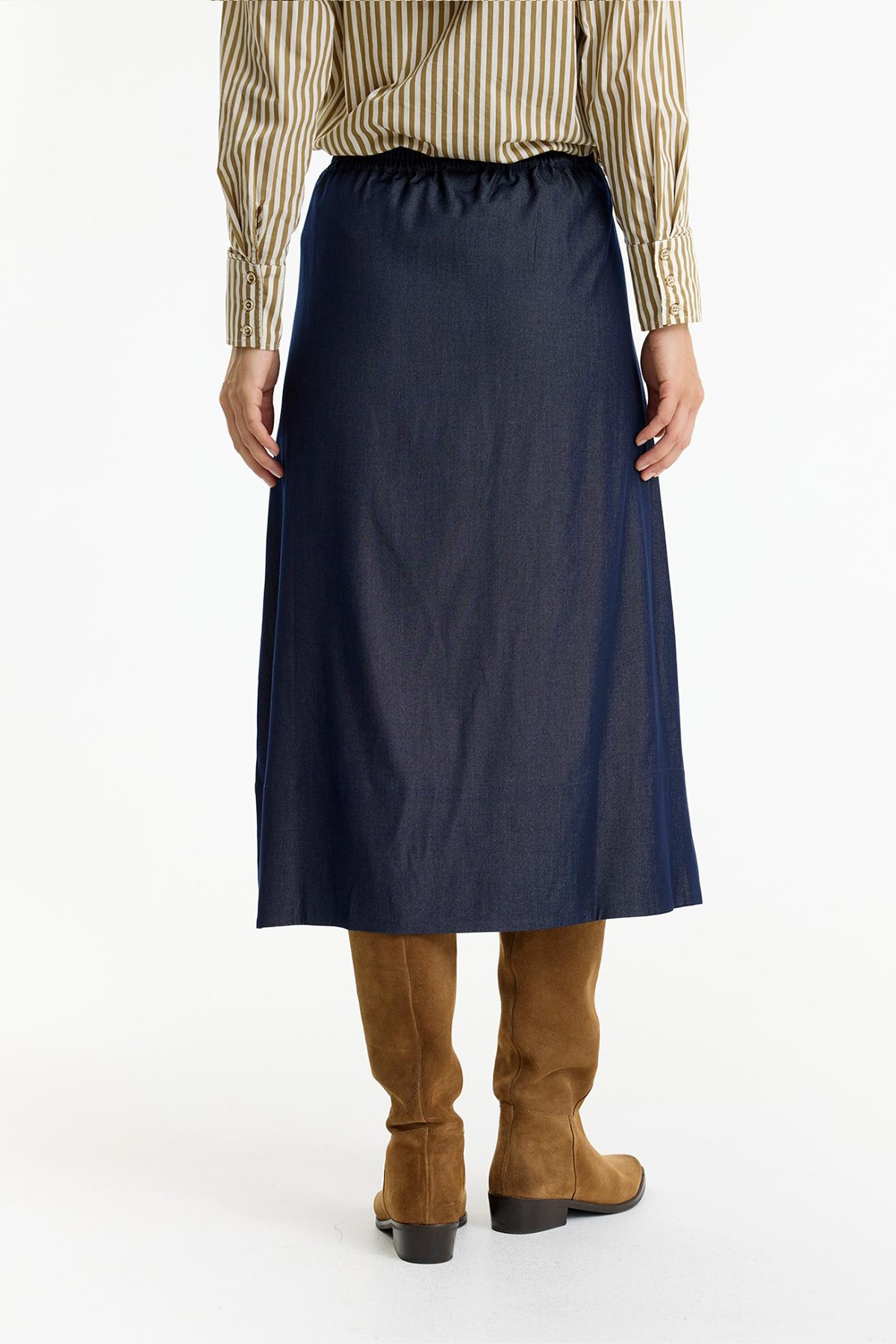 Kjolen har en smickrande A-linjeformad siluett som ger ett vackert fall och fin rörlighet. Den är designad med en bred elastisk midja som garanterar en perfekt passform och gör den enkel att ta på och av. Materialmixen med en hög andel viskos ger tyget en diskret lyster och en lyxig känsla, medan stretchen ser till att kjolen behåller sin form. Matcha med en instoppad skjorta eller en nätt topp för en stilsäker och välklädd look.
