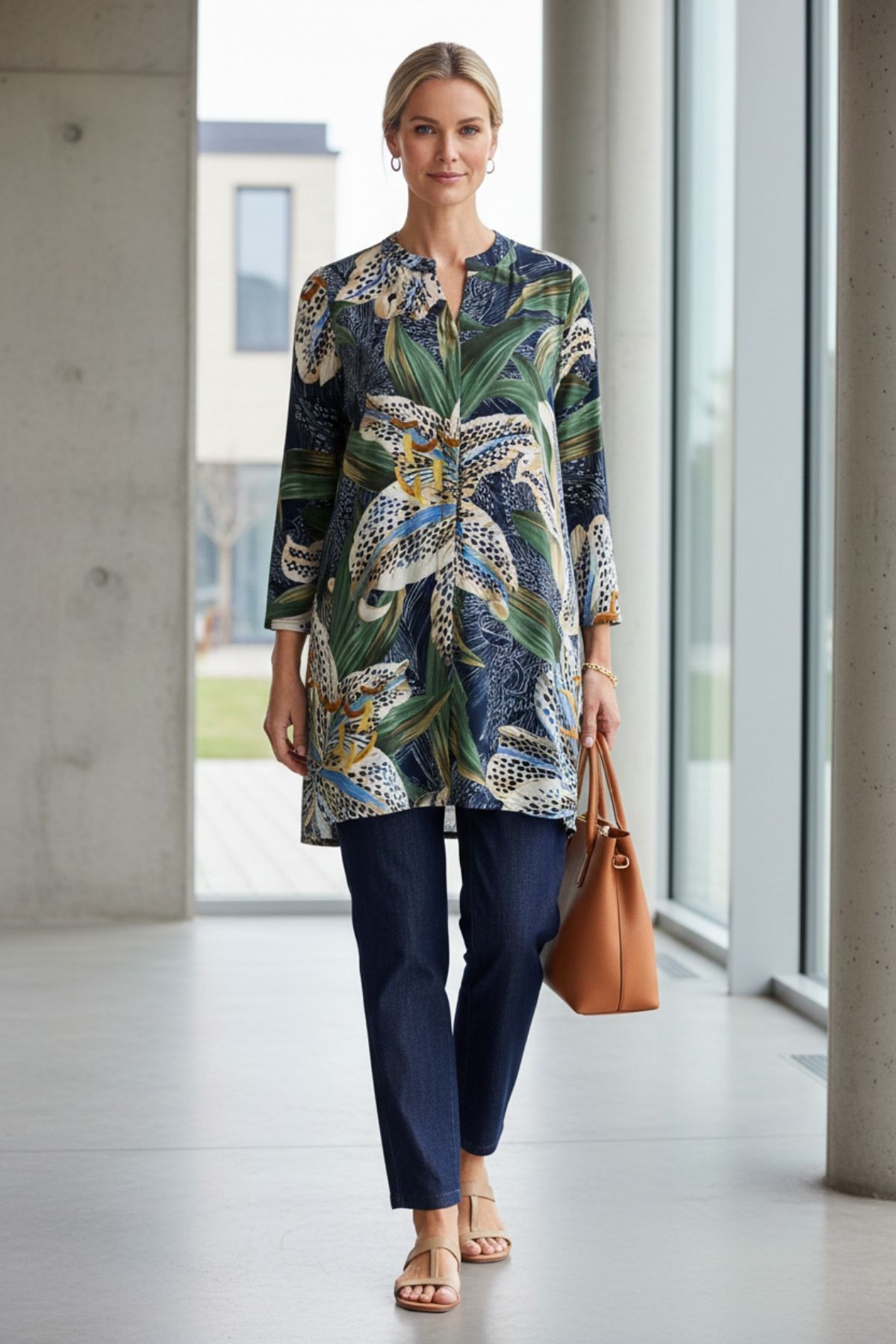 Ge din stil en upplyftande och lyxig känsla med InFront Maracollina Leilani. Denna tunika fångar blicken med ett storslaget, botaniskt mönster där dramatiska liljor i vitt och blått möter frodiga gröna blad mot en djup navyblå botten. Det är ett plagg som utstrålar både självklar elegans och en somrig friskhet.