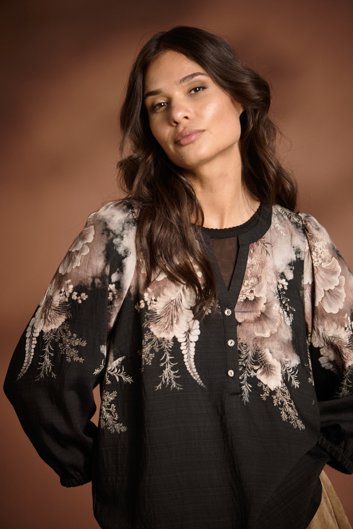 Denna blus har en rak, lös passform som ger en avslappnad och elegant silhuett. Det intressanta mönstret i svarta och bruna toner ger liv åt varje outfit, medan V-ringningen med tre knappar skapar en sofistikerad detalj. Puffärmar med resår vid ärmslutet ger en feminin touch och subtil volym, perfekt för både vardag och fest.