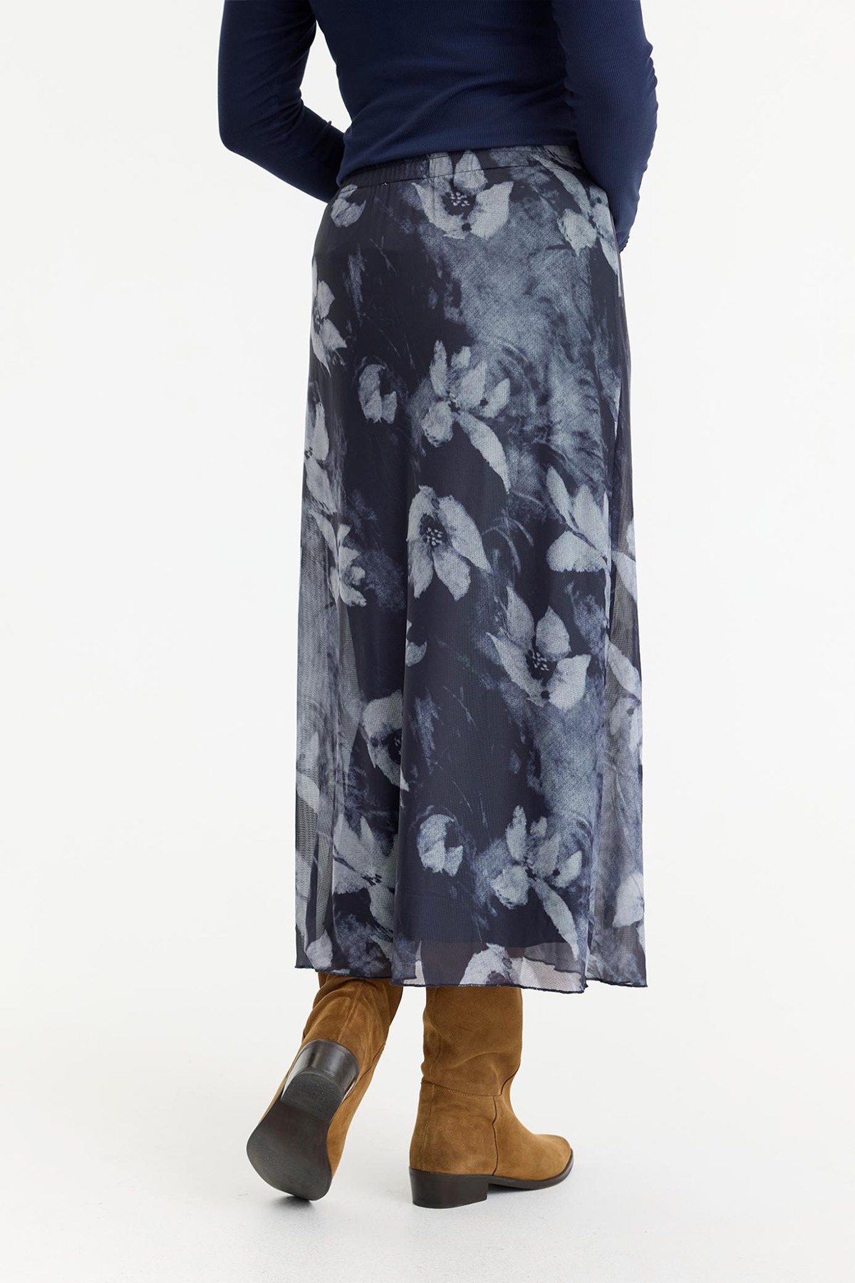 Kjolen har ett fantastiskt vackert fall tack vare det följsamma materialet och den genomtänkta skärningen. För att maximera din komfort är den försedd med ett foder i 100% viskos, vilket gör att den faller snyggt utan att klistra sig mot benen och känns sval mot huden. Den elastiska midjan ger en perfekt passform och gör den enkel att bära hela dagen, oavsett om du matchar den med en stickad tröja eller en lätt blus.