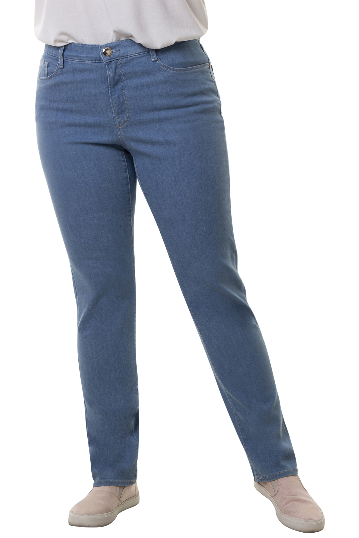 Mary 5-ficks byxa Blue Planet denim, med ett rakt smalt ben och hög midja, smal passform för dig som vill ha mer vidd runtom midjan utan att det blir för stort runt höfter och lår. Byxan knäpps med knapp och blixtlås framtill.