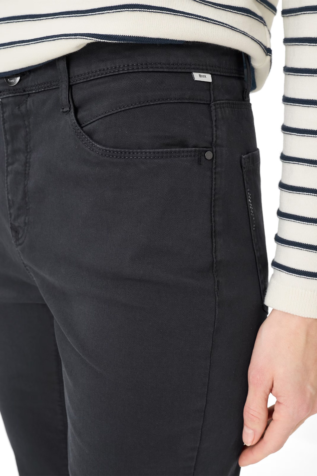 Detaljer: Femficksmodell med slipfickor, myntficka och påsydda bakfickor. Subtila strass-element ger en sofistikerad touch.