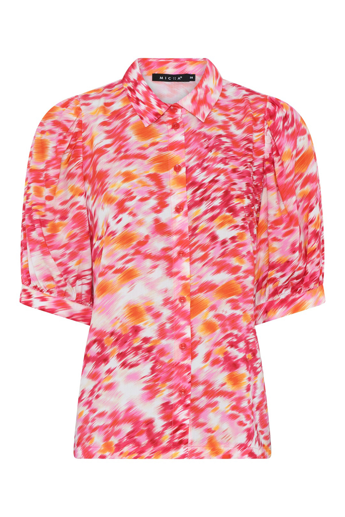 Mönstrad blus från Micha med kort ärm. Blusen är rak i modellen med insnitt vid bysten och något lös i passformen. Knäpps med åtta knappar framtill och blusen har rynkor på axeln samt en mindre variant av ballongärm.