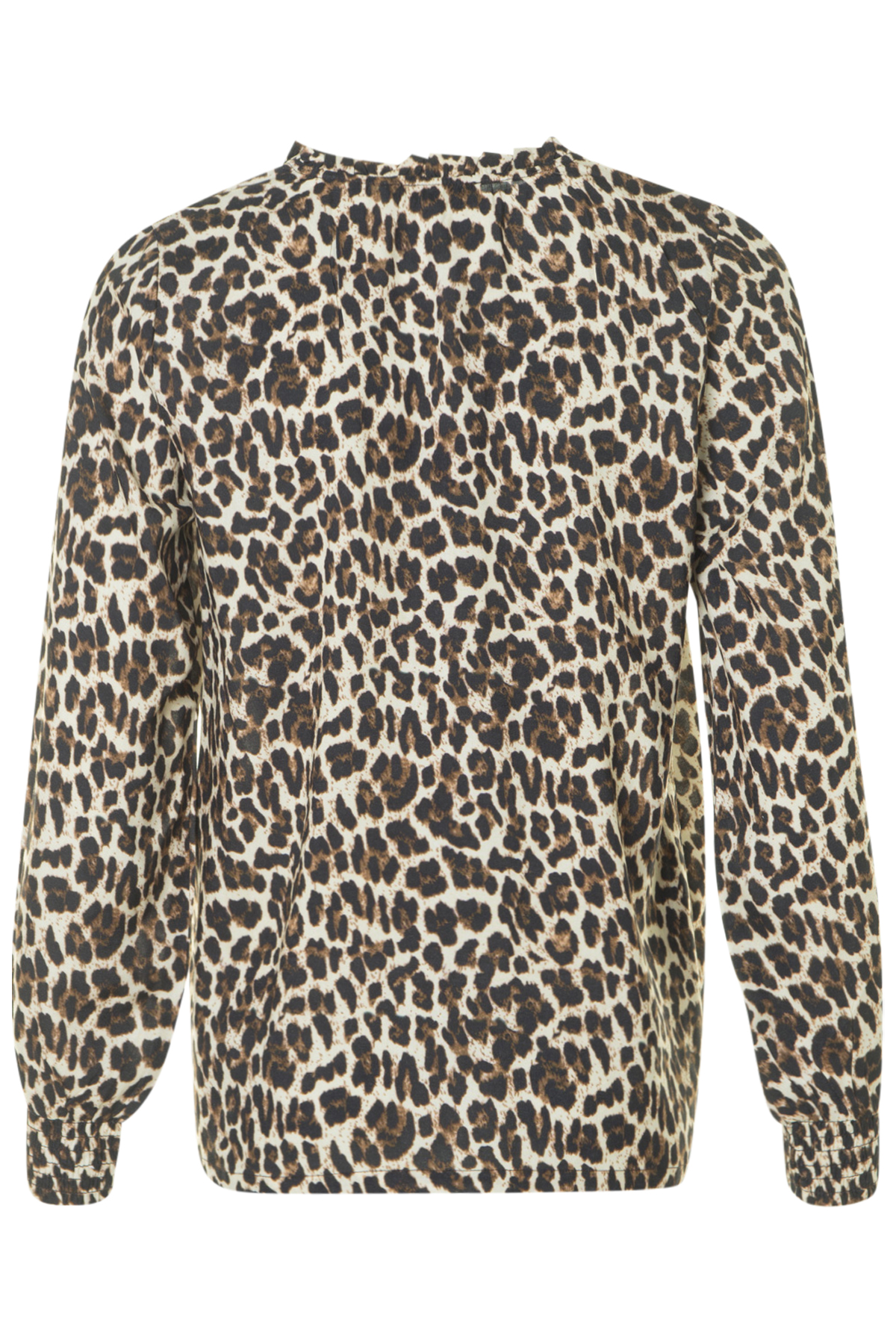 En härlig leopad-mönstrad blus från Micha med lång ärm. Blusen har rund hals med ett sprund med fem klädda knappar, samt en volang i samma tyg längs halsringningen. Blusen är rak i modellen med rymlig passform. Den har resår i ärmsluten och är tillverkad av en sval och skön viskos.