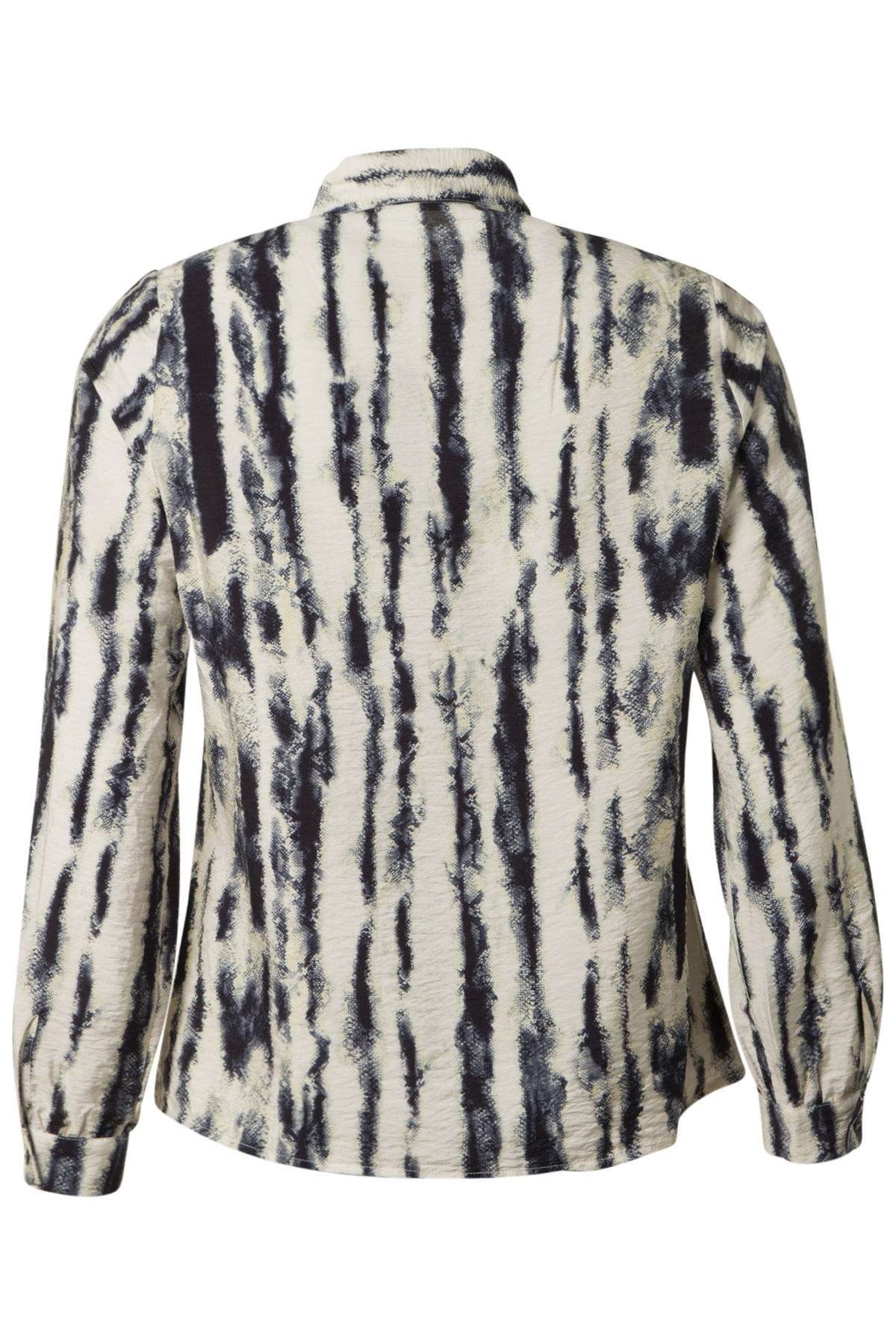 Micha Blus Nagoya är en en elegant mönstrad blus med lång ärm med manschetter med knapp. Blusen har klassisk skjortkrage och knäpps med åtta knappar fram. Blusen är rak i modellen och rymlig i passformen, samt har insnitt vid bysten. Den är tillverkad av en mjuk sval viskosmix.
