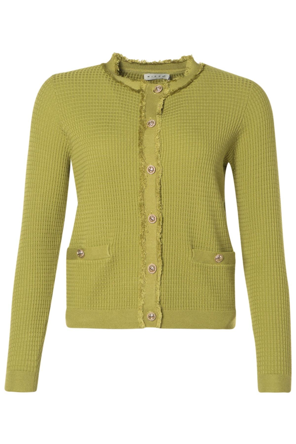 Micha Cardigan Dangjin, är en elegant cardigan i Chanell-stil. Koftan är rak i modellen och normal i passformen och har en liten frans-kant runt om halsringning och knappslå.