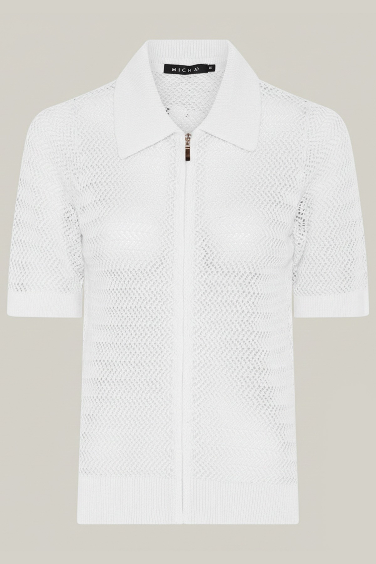 Designen utmärks av ett vackert genombrutet mönster i sicksack-struktur, vilket ger plagget en feminin och lyxig karaktär. Koftan har en klassisk skjortkrage och en praktisk dragkedja framtill vilket ger en modern touch. De korta ärmarna och nederkanten avslutas med täta, ribbstickade muddar som ger plagget en fin inramning och en välskräddad siluett. Den krispigt vita färgen gör den oerhört lätt att kombinera med allt från mönstrade kjolar till stilrena chinos.