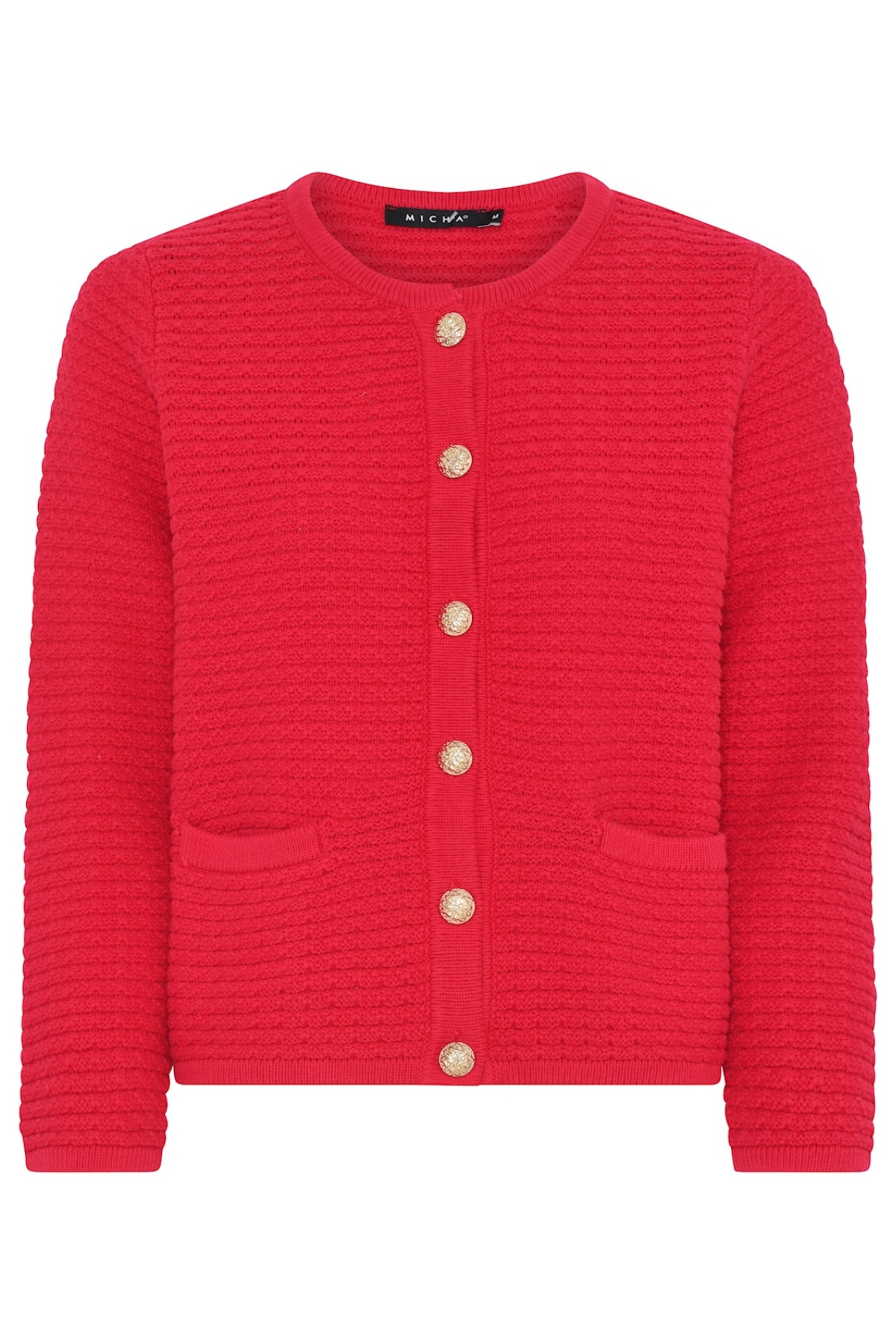 Micha Cardigan Marseille i den livfulla nyansen Lipstick Red är en elegant och tidlös kofta som utstrålar sofistikation. Den har en klassisk rund hals och långa ärmar, vilket ger en snygg och feminin silhuett. Den raka modellen med normal passform gör koftan mångsidig – den är lika elegant att bära som en lätt jacka öppen, som knäppt som ett topplager.