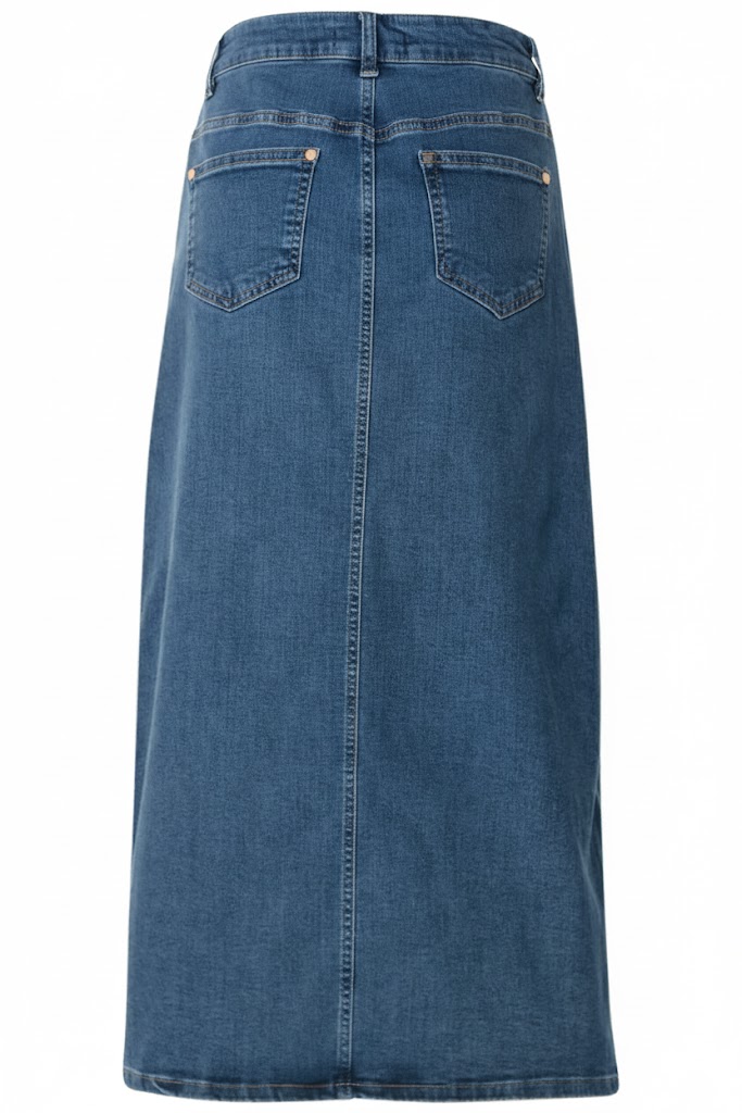 En klassisk jeanskjol från Micha. Kjolen knapp och dragkedja fram och den har typiska jeansfickor framtill och utanpåfickor bak. Kjolen är tillverkad i stretchig denim med sydda sömmar och något mer vid nedtill.
