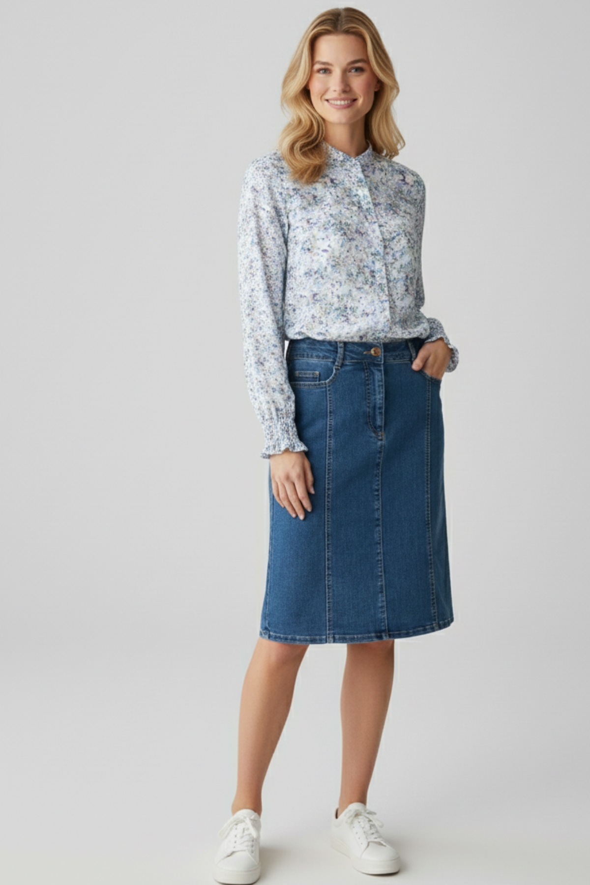 Micha Jeanskjol Malibu en klassisk jeanskjol från Micha. Kjolen knapp och dragkedja fram och den har typiska jeansfickor framtill och utanpåfickor bak. Kjolen är tillverkad i stretchig denim med sydda sömmar och en slits mitt bak.