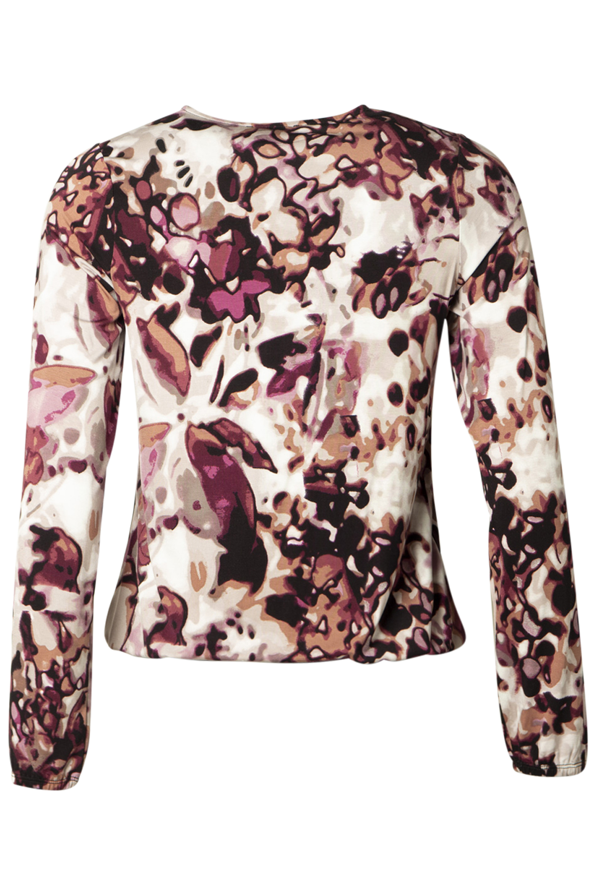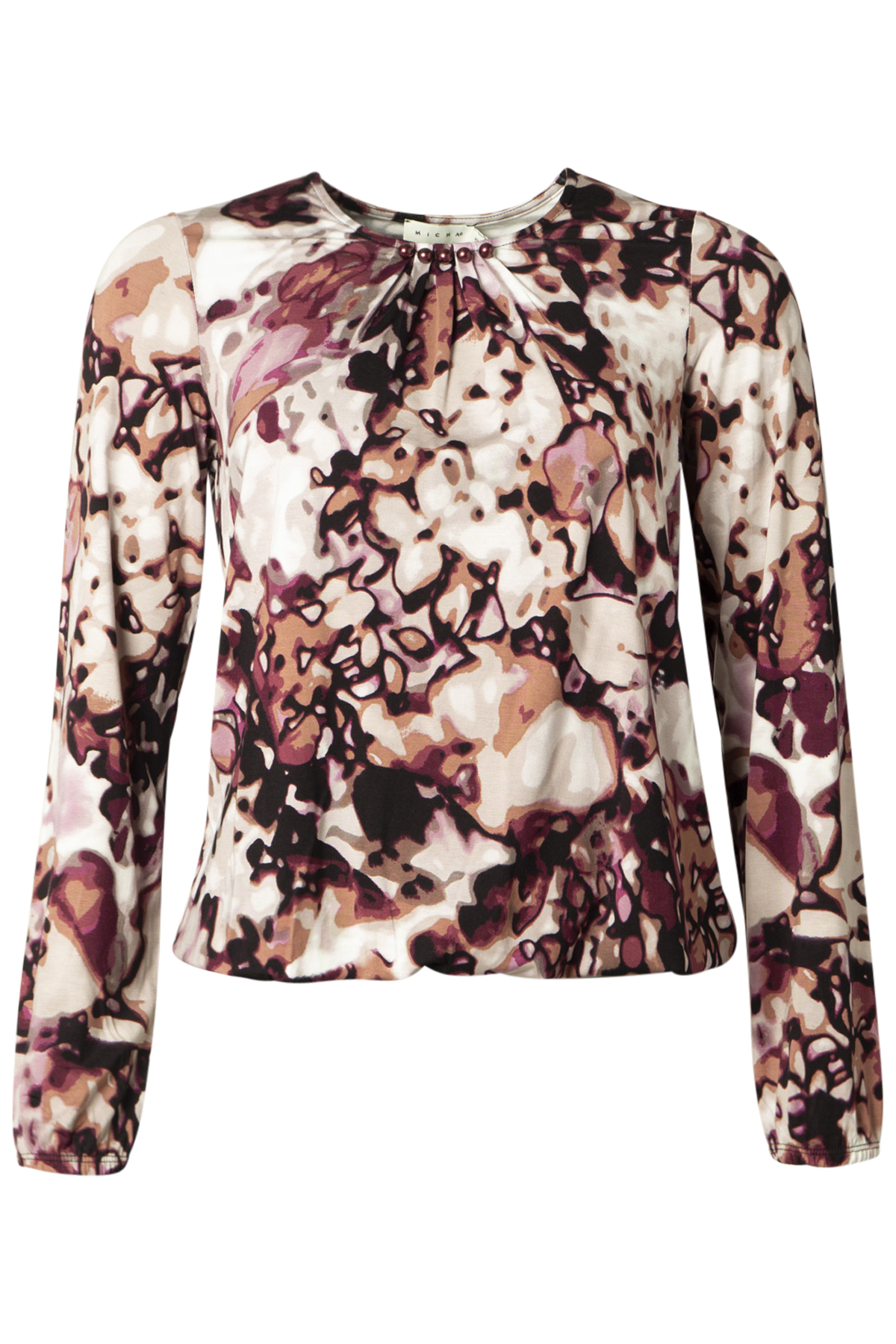 Micha Jerseyblus Sagamihara. En fin supermjuk topp med lång ärm från Micha. Toppen har rund hals med ett dekorativt parti med lagda veck och fem runda pärlor fram. Den är rak i modellen och vid i passformen, med en resår nertill och i ärmsluten.