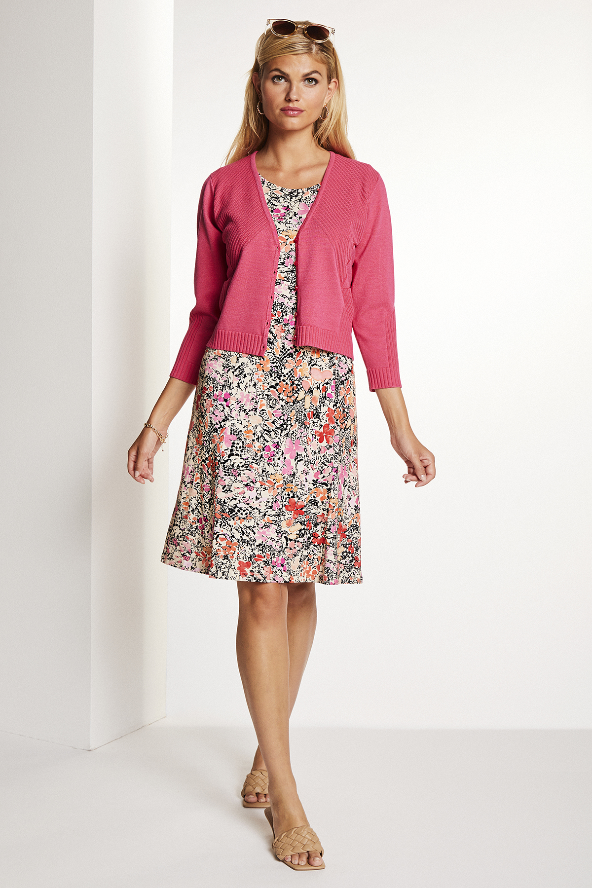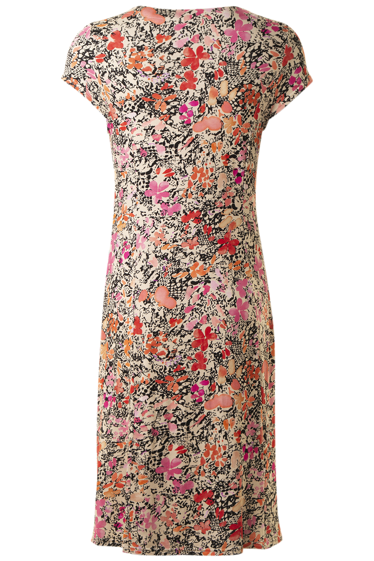 Den är mönstrad i rosa, orange och svart på en beige botten och är tillverkat av en sval och skön viskoskvalitet.